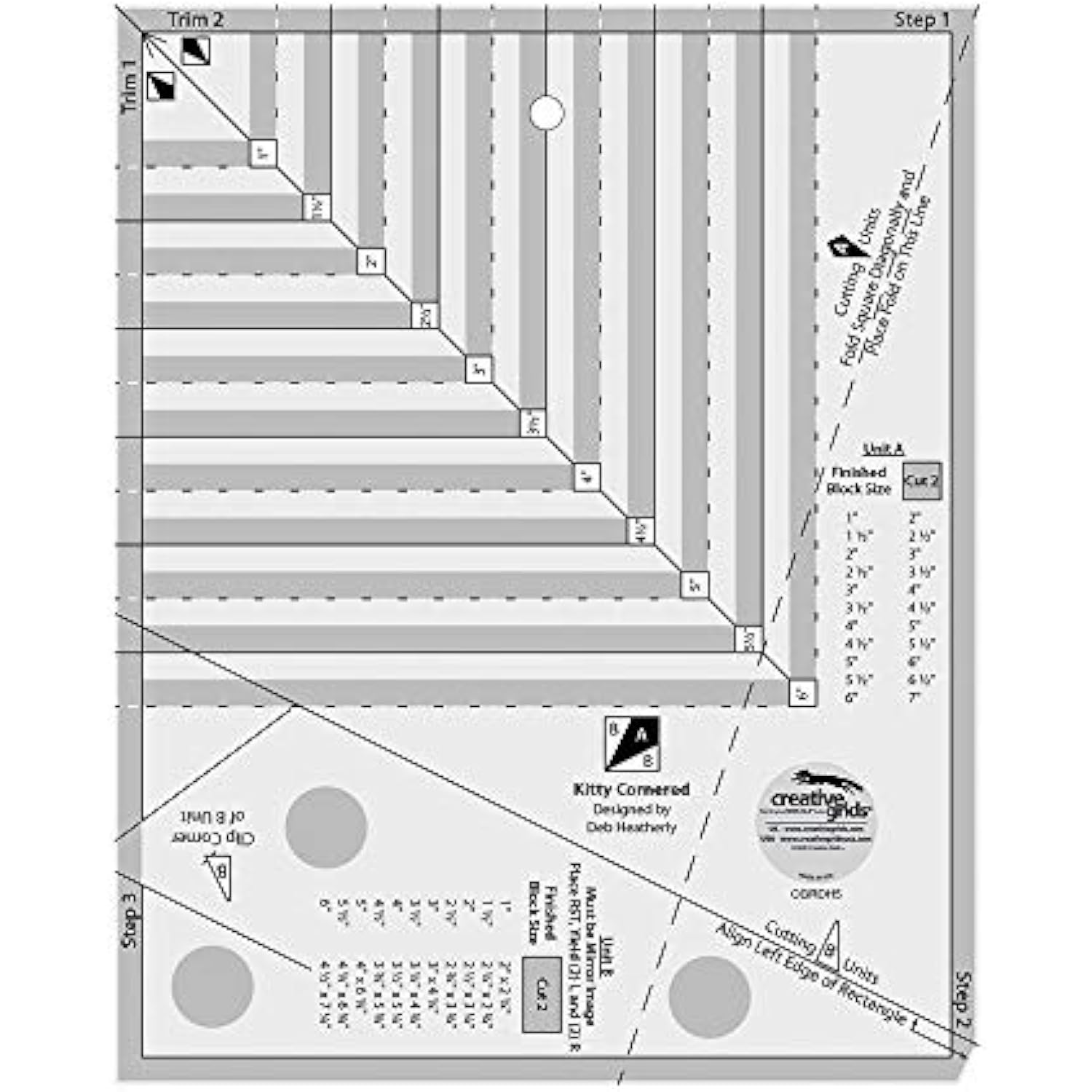 Make eleven different sizes of the Kitty Cornered block – two at a time! Cut the odd angles with the tool, then trim them down to size after sewing. Fast, easy and accurate! Make two Kitty Cornered blocks at one time - the printed cutting chart is right on the tool! Create eleven sizes from 1 to 6 inches - and every half inch in between. The tool comes with fully illustrated step by step instructions or view a video demonstration. The tool slides easily over the fabric until pressure is applied. Then, our exclusive gripper holds the fabric in place while cutting, eliminating slipping and miss-cuts! Total Size - 8in x 10in