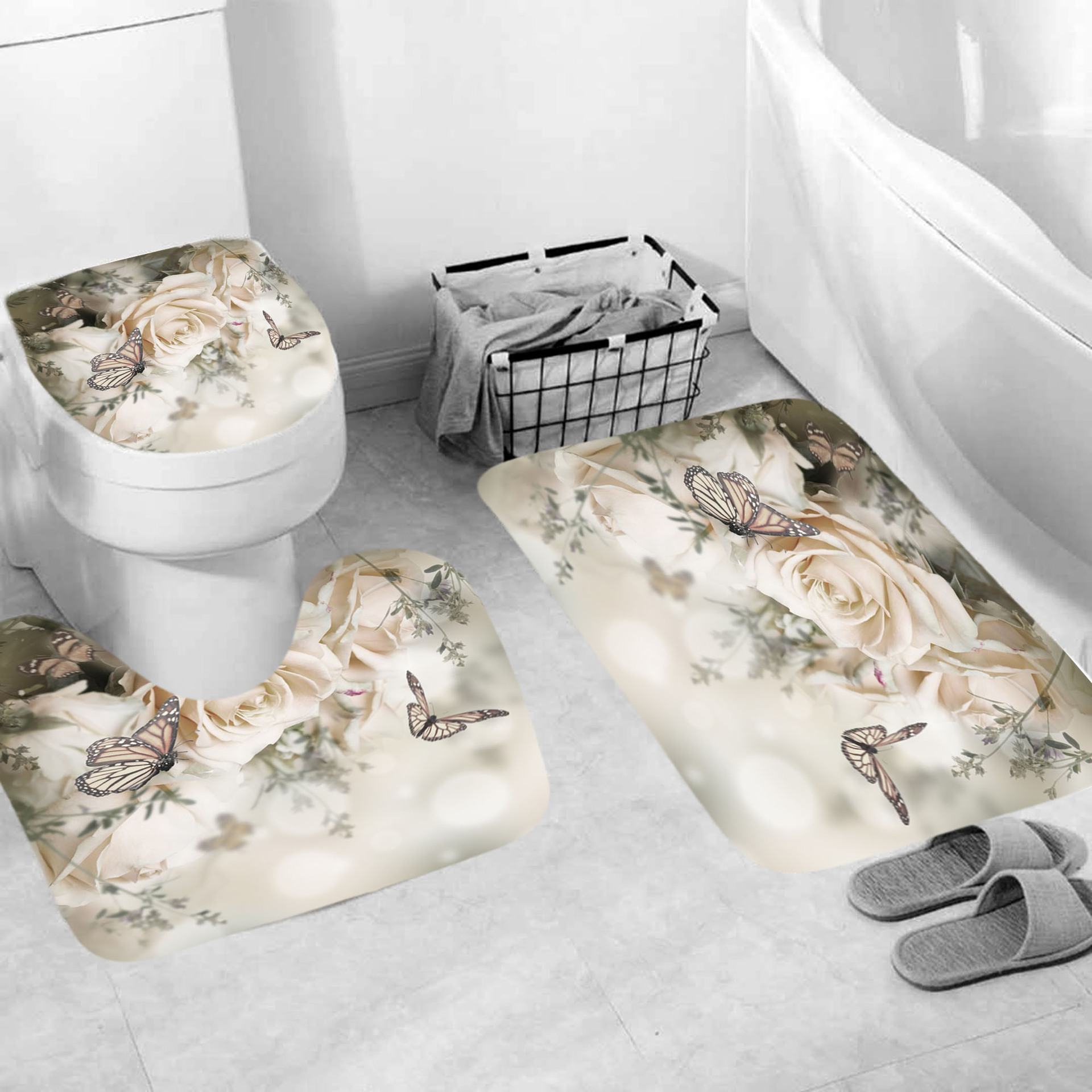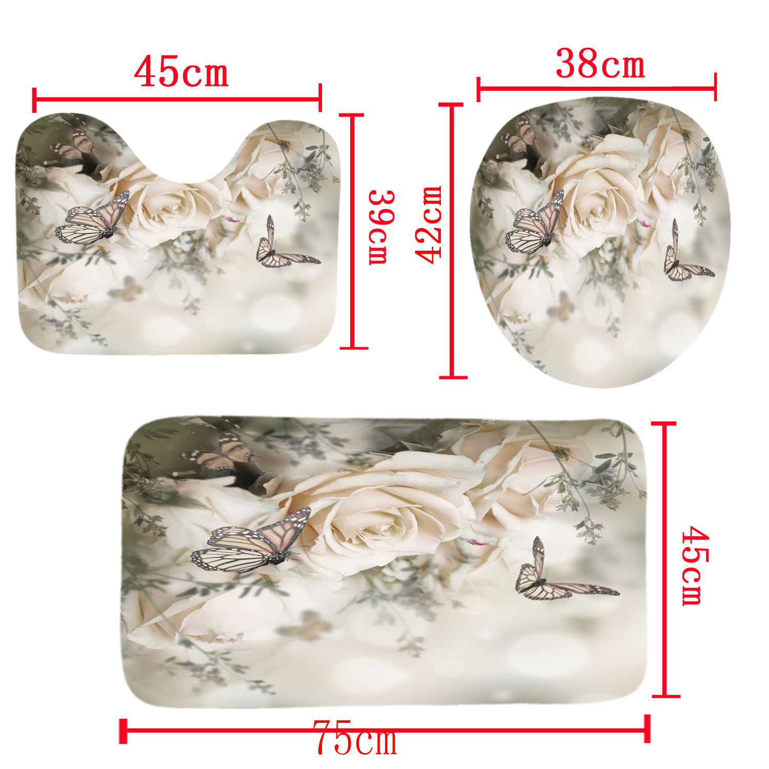 Material :Shower Curtain: Polyester + 3Pcs:Flannel and plastic bottom blanket surface.