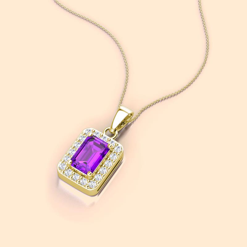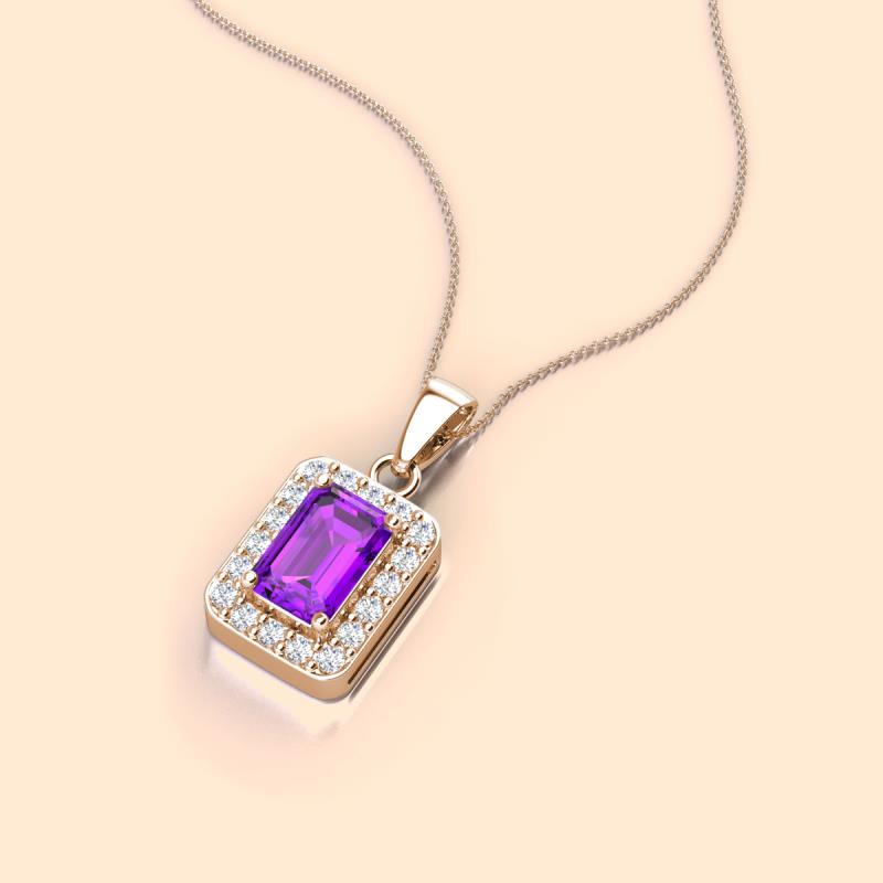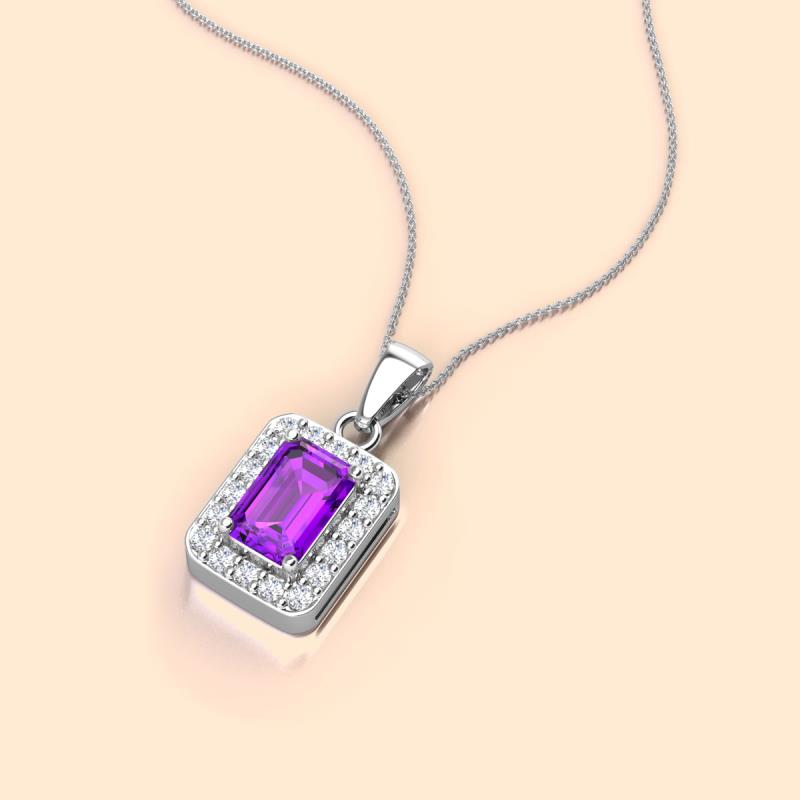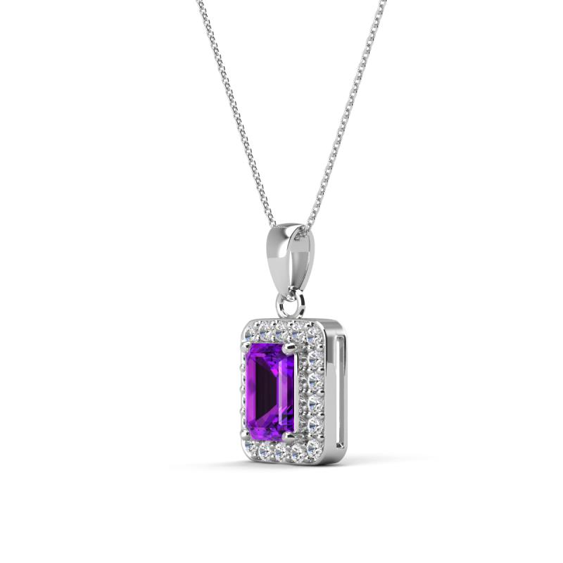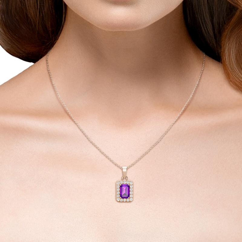 DetailsFeaturing a unique design, this glittering Emerald-cut Amethyst surrounded by a "halo" of smaller diamonds for a luxurious look. It is secured in prong setting and linked by a cable chain that makes it comfortable and stunning.