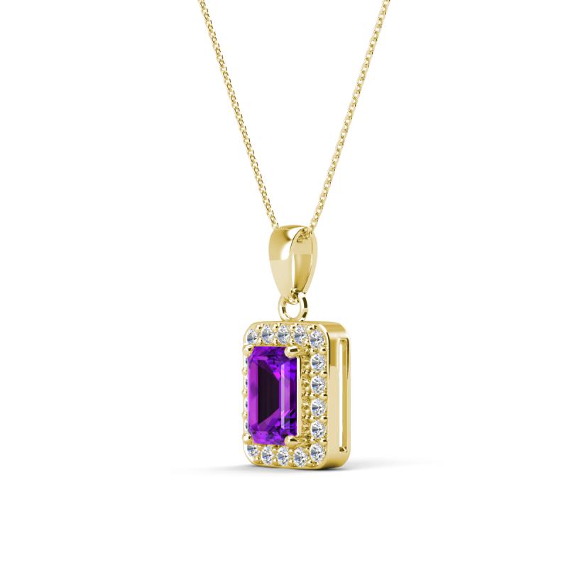 Emerald Cut (6x4 mm) Amethyst and Round Diamond 0.73 ctw Womens Halo Pendant Necklace 14K Gold. Included 16 Inches 14K Gold Chain