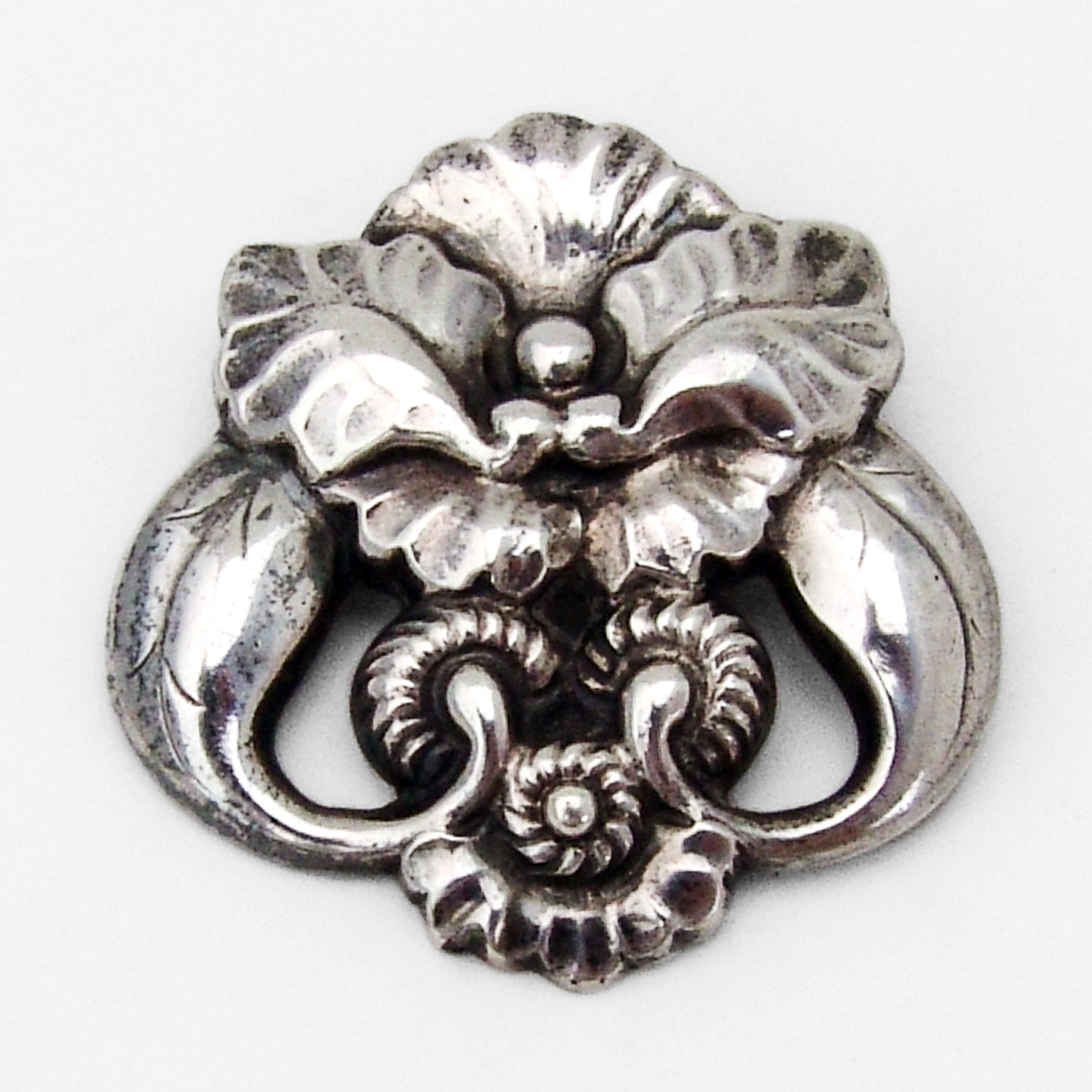 Danish designer Georg Jensen 830 standard silver brooch in the Number 97 pattern, featuring stylized flower & leaf motifs. c. 1915-1927.