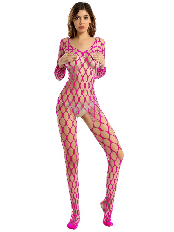 Women V Neck Long Sleeve Crotchless Bodystocking Stretchy Fishnet Bodysuit.