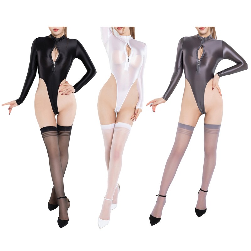 Women Shiny Patent Leather Bodysuit Wet Look Leotard Jumpsuit Stand Collar Long Sleeve Zipper Catsuit Clubwear.
