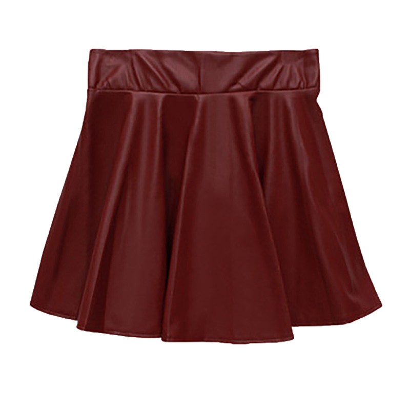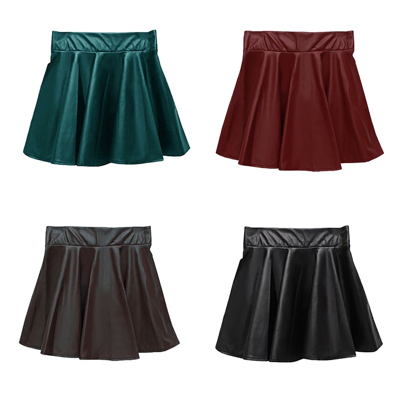 Women High Waist Faux Leather Flare Skirt Ladies Casual Solid Color Ruffled Miniskirt.