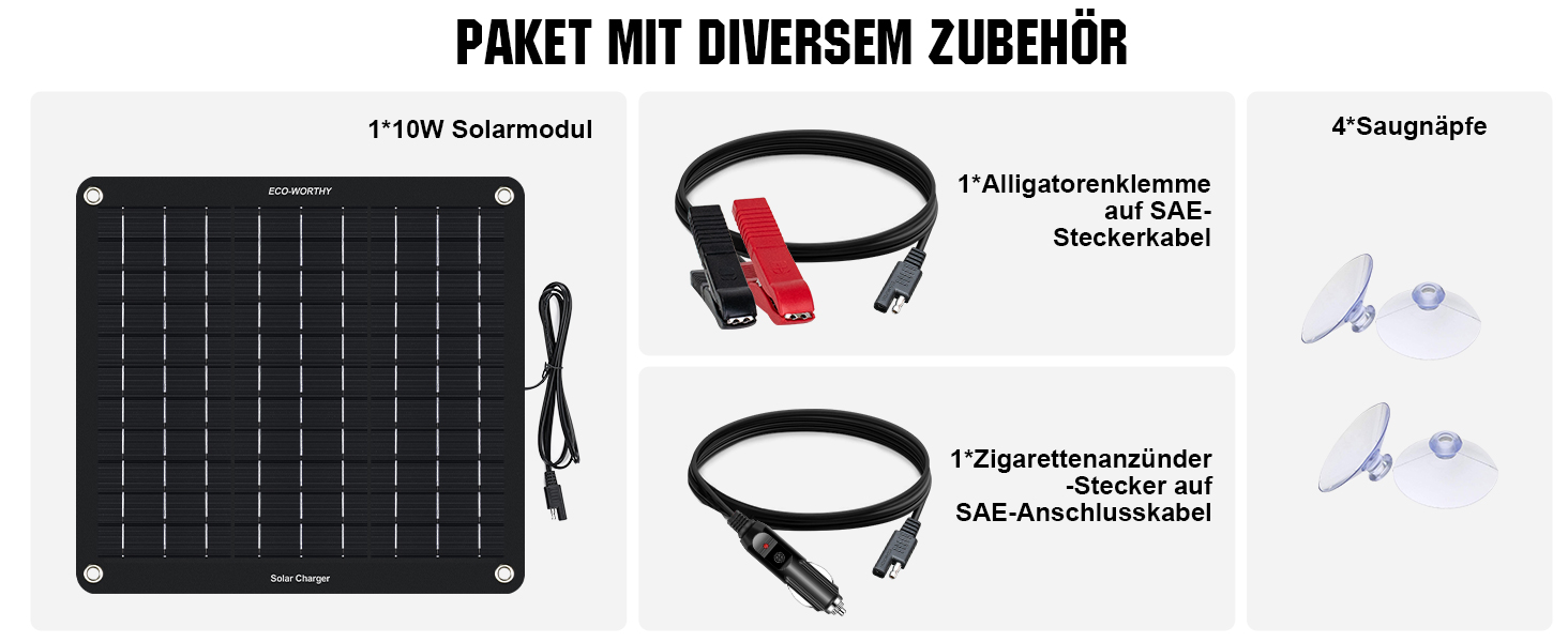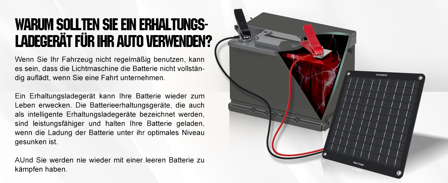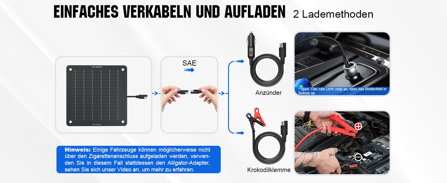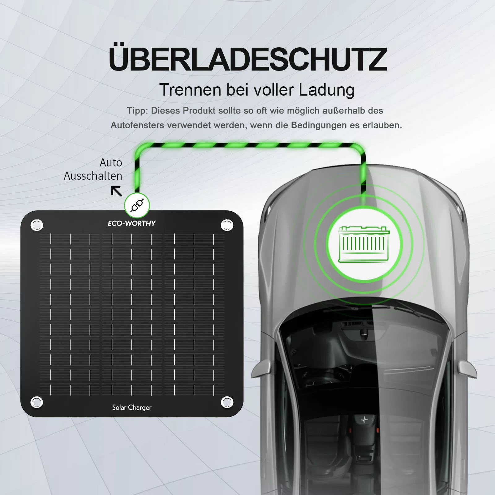 Die 12V-Batterie wird nicht ordnungsgemäß über 12,4 V gehalten, es kommt zu Sulfatierung, die die Hauptursache für den Batterietod ist. Aus diesem Grund entlädt sich die Fahrzeugbatterie bei zu langem Abstellen des Fahrzeugs leicht. Eco-Worthy Solar Erhaltungsladegerät verlängert die Lebensdauer durch kontinuierliches Erhaltungsladen der Batterie.