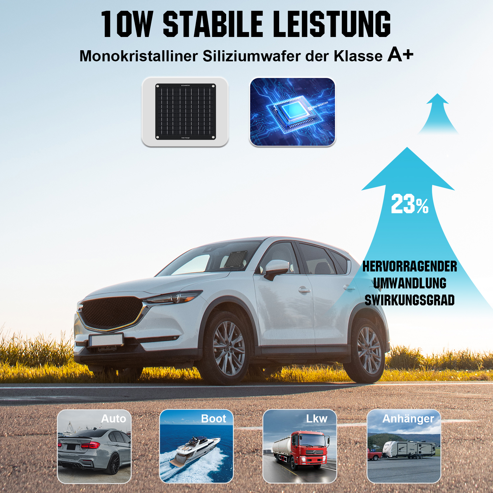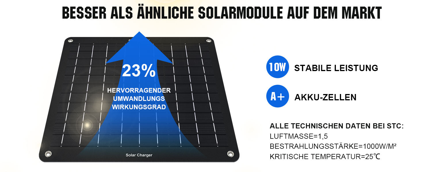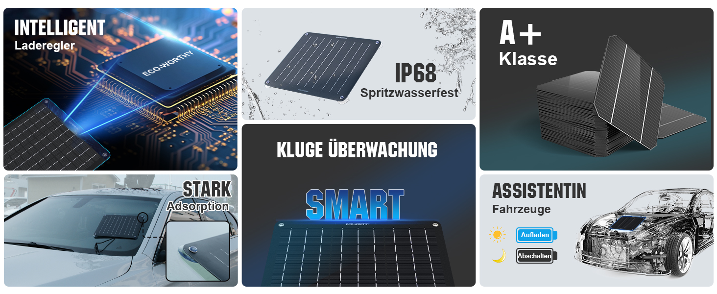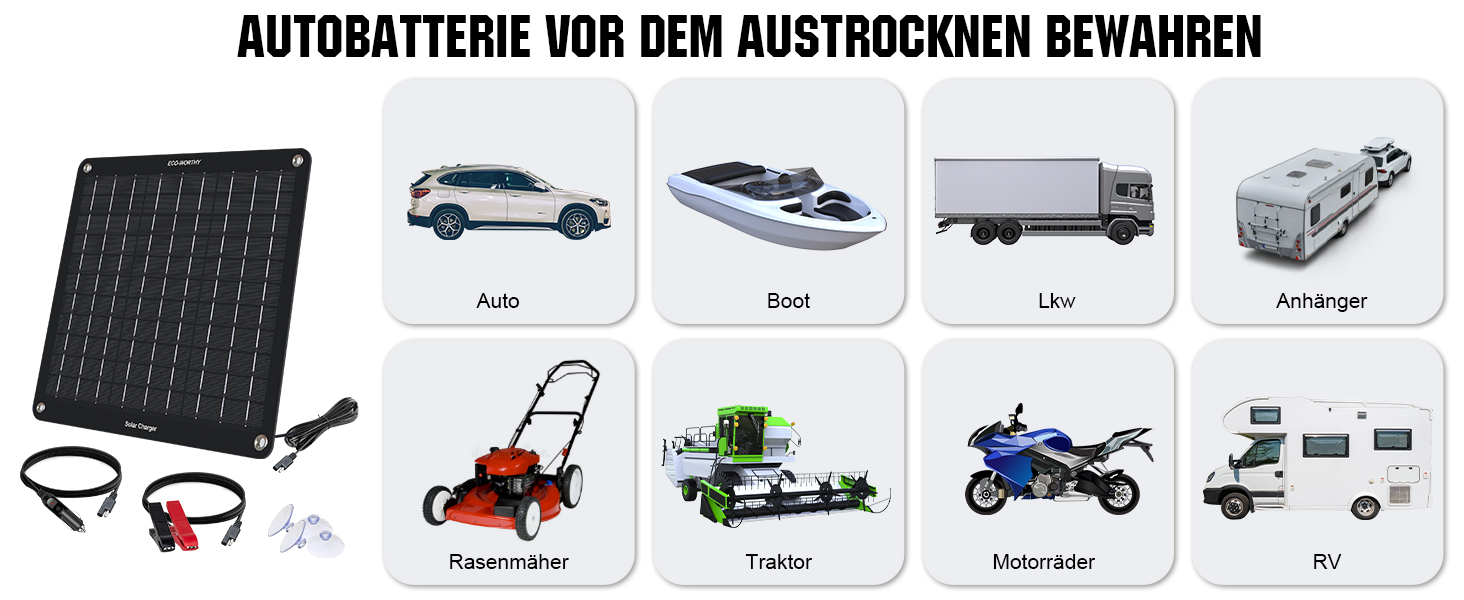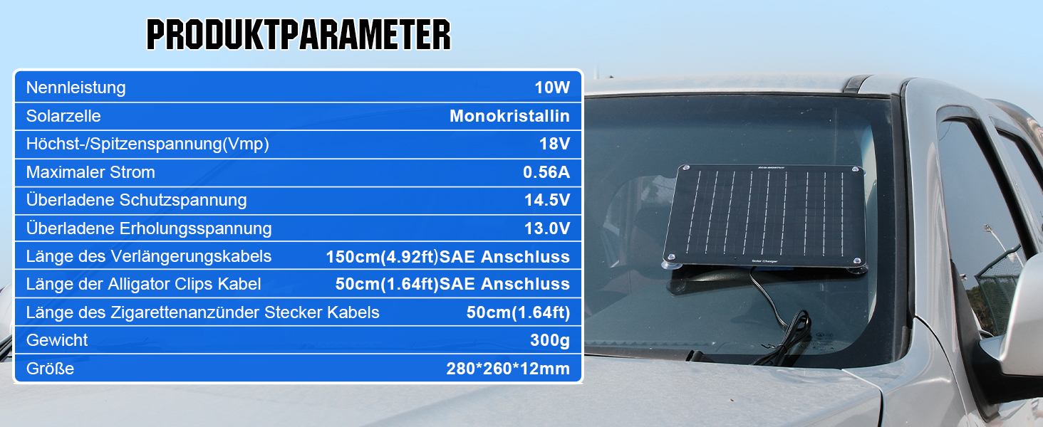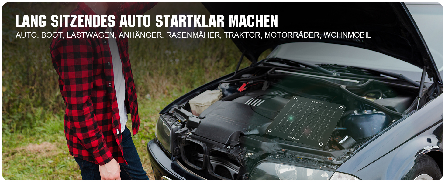 Die Autobatterie wird bei Nichtgebrauch natürlich entladen, und mehr als 30 elektrische Module wie Computer, Alarmsysteme, Diebstahlsicherungen und Türschlossüberwachung verbrauchen alle Batteriestrom. Diese Probleme erschweren den Start. Das Solar-Erhaltungsladegerät löst das Startproblem, indem es die Batterie aktiv hält.