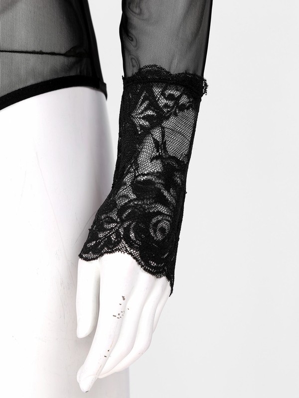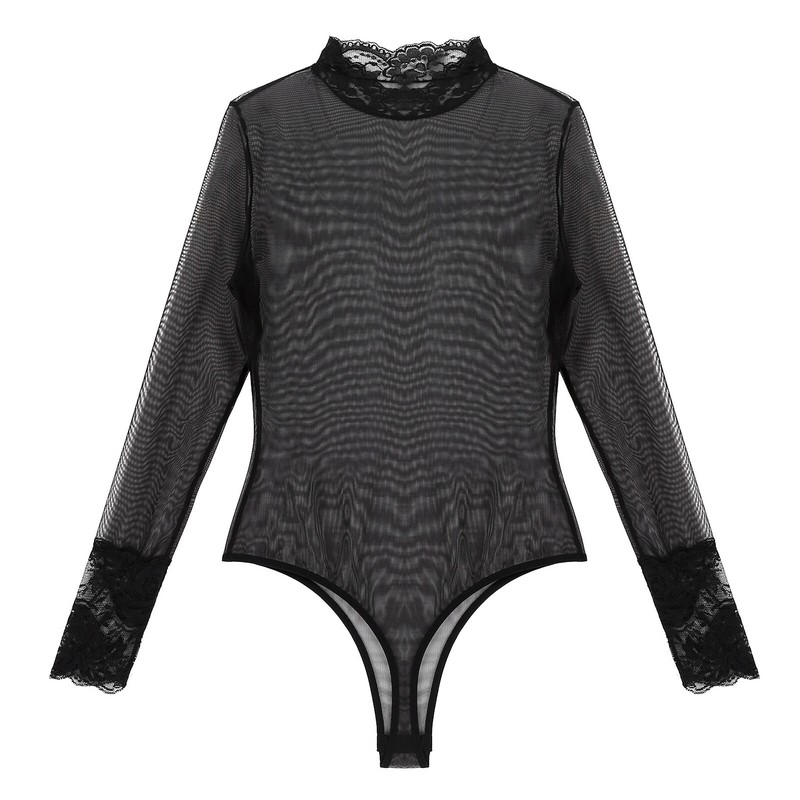 Womens Lace Trim Mock Neck Long Sleeve Bodysuit See-through Mesh Leotard.