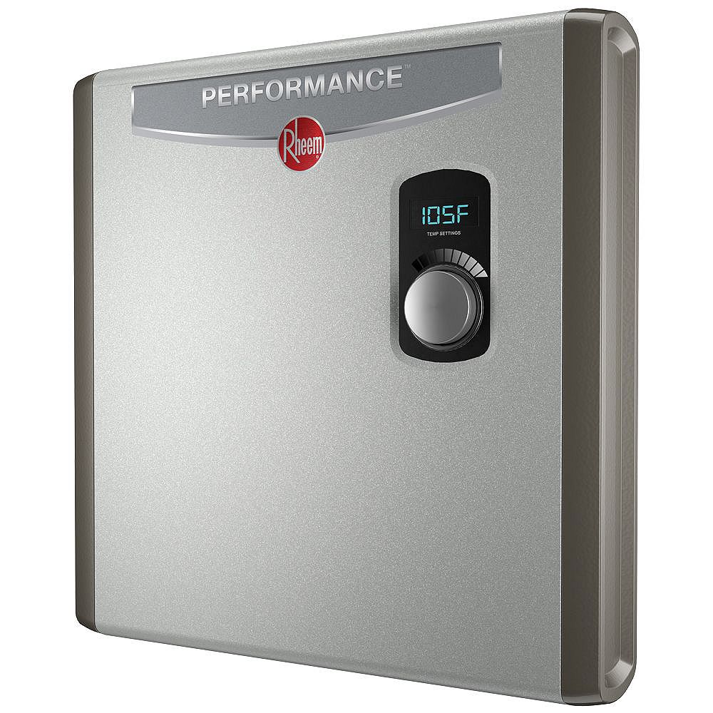 This water heater provides instant and continuous hot water for up to 1 shower and 1 faucet. Tankless Electric Water Heaters help reduce energy usage, save on energy costs, and are small so they will be a perfect match for installations under a cabinet or sink in your home, office, boat or RV. Incoming water temperatures, hot water demand and size of the tankless unit installed are all factors in meeting your hot water needs. If your requirements exceed a sink faucet and shower, it's recommended that you consider a Rheem 36 kW unit. Requires 3 x 40 AMP double pole breakers with 8 gauge wire (professional installation recommended).