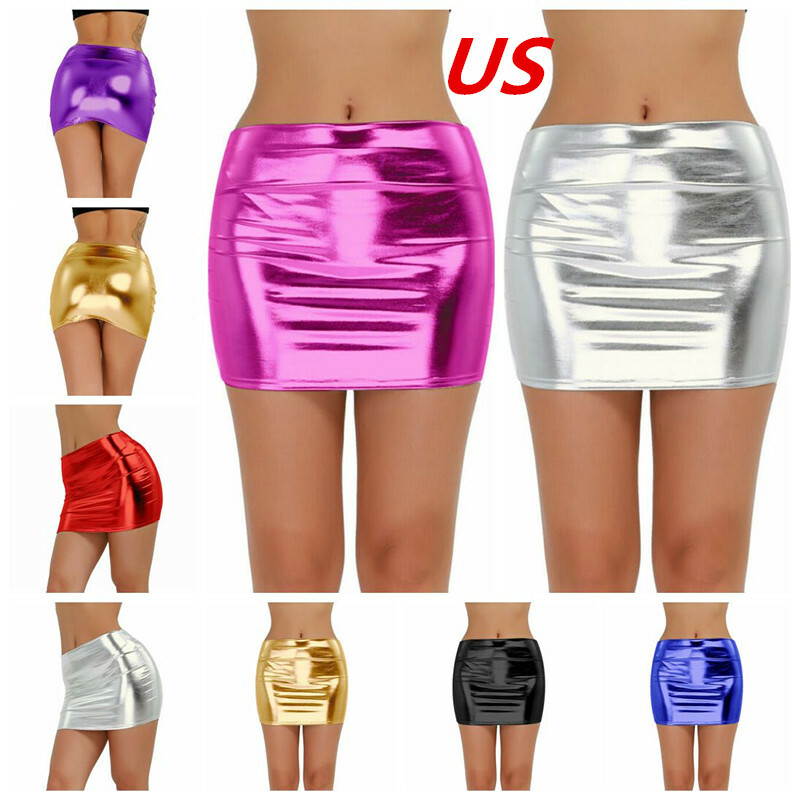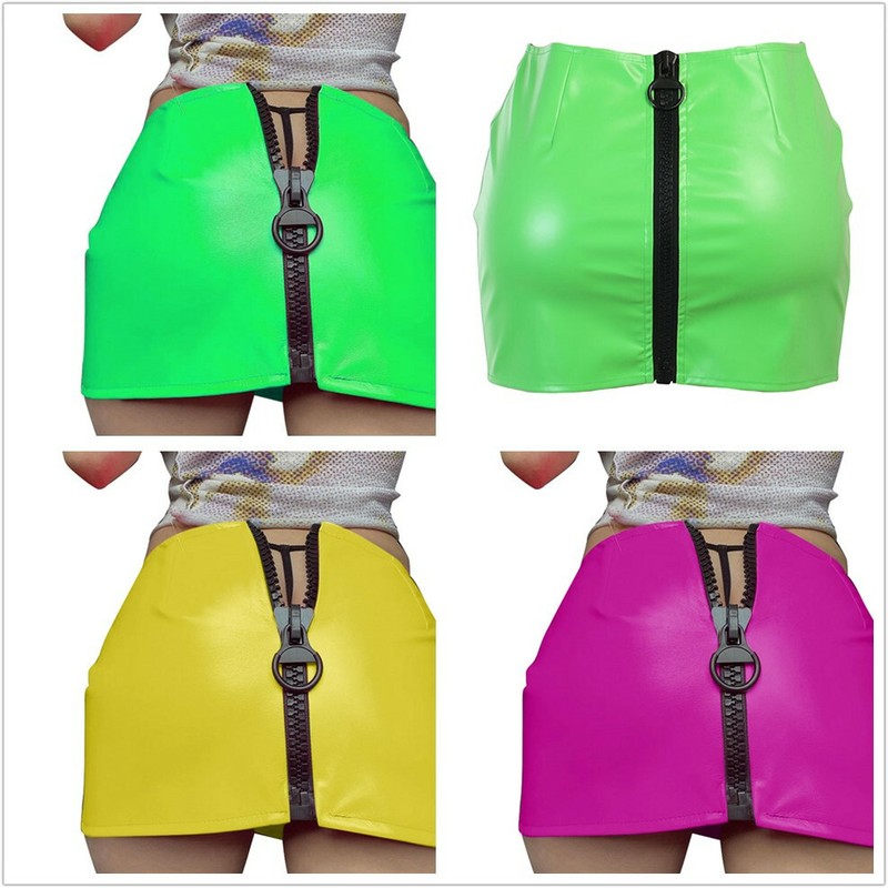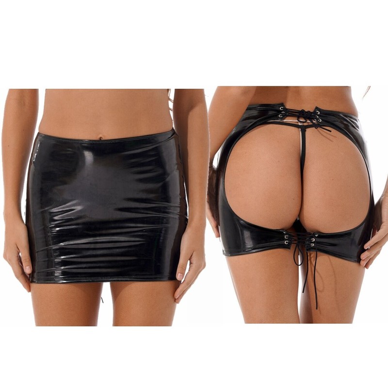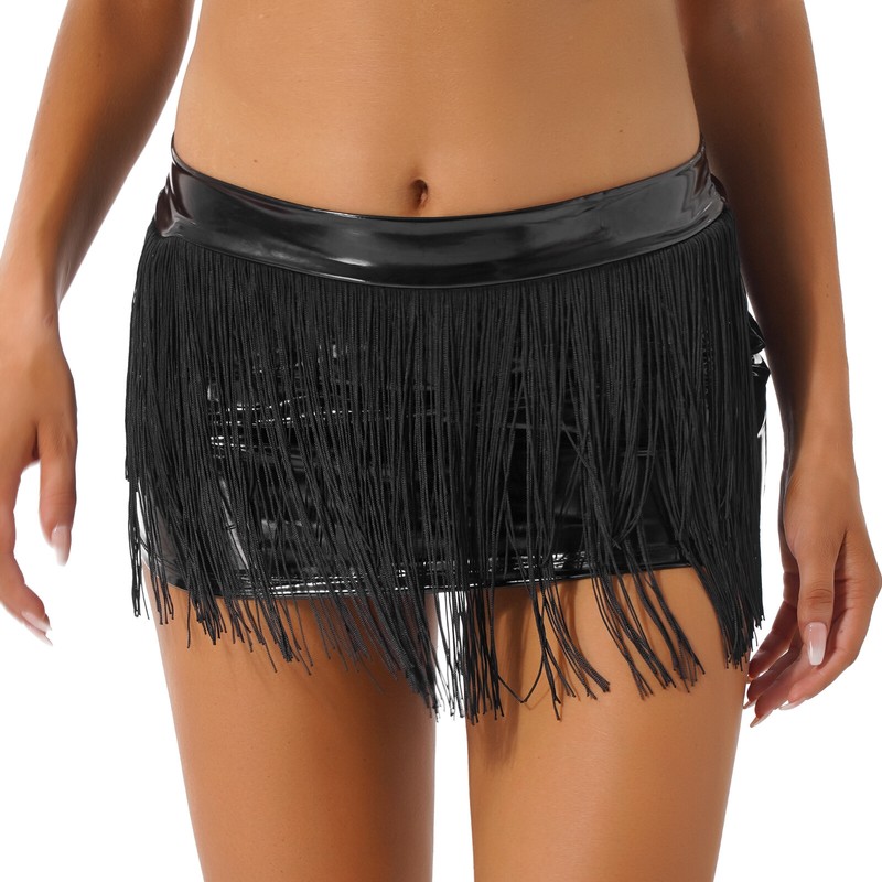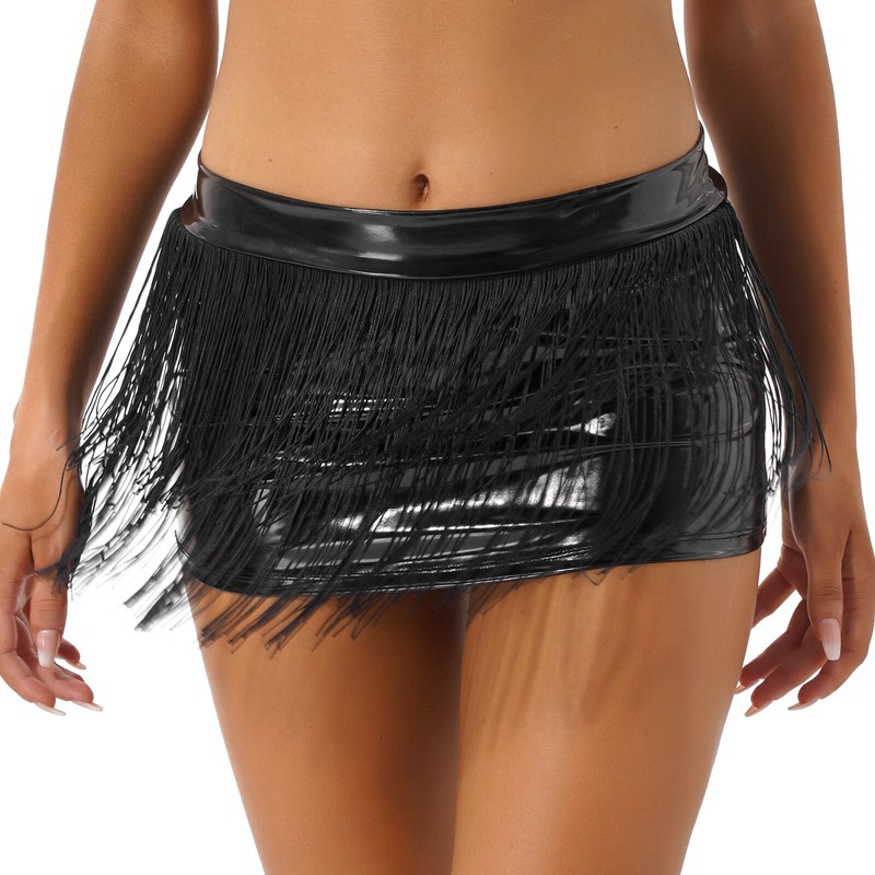 Women Wet Look Patent Leather Fringed Miniskirt Low Waist Tassel Skirt for Stage Performance.