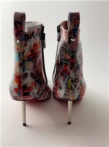 These seductive patent leather ankle boots are set atop a spiked metal heel.