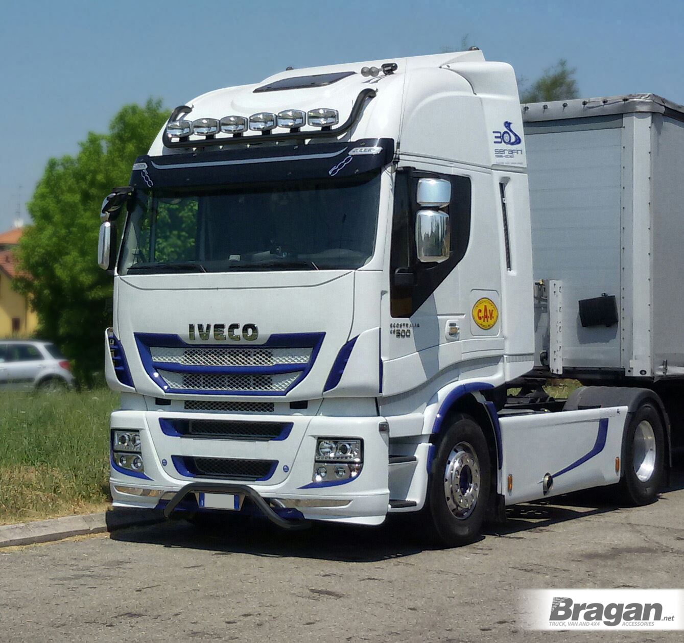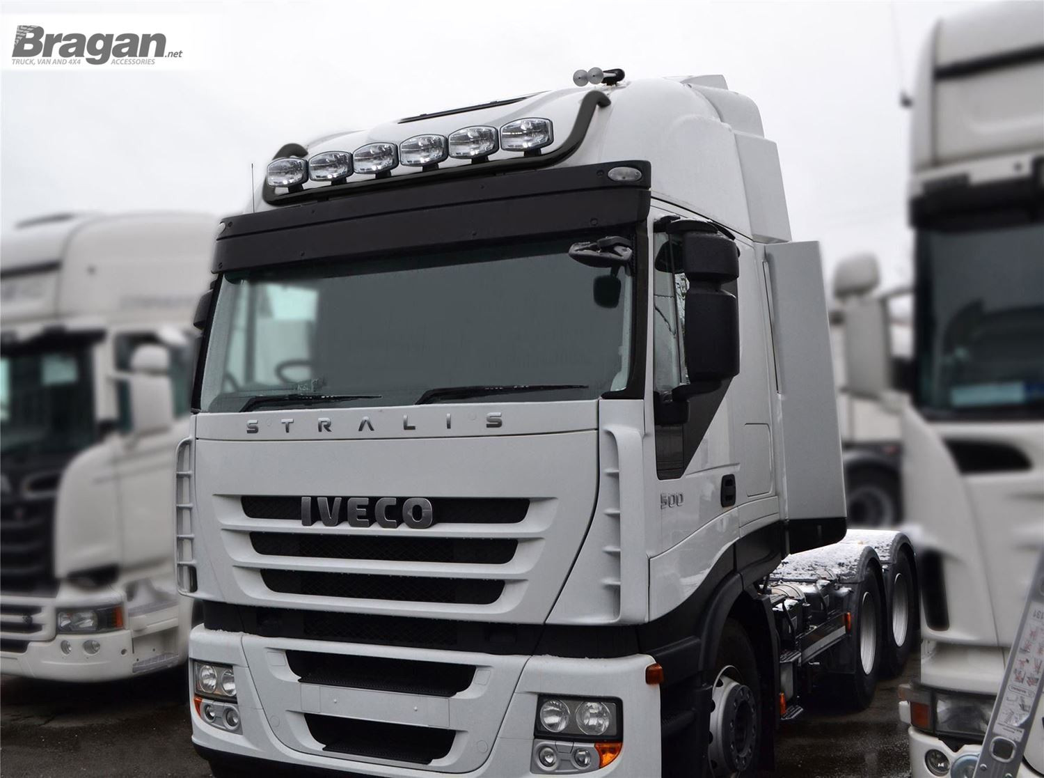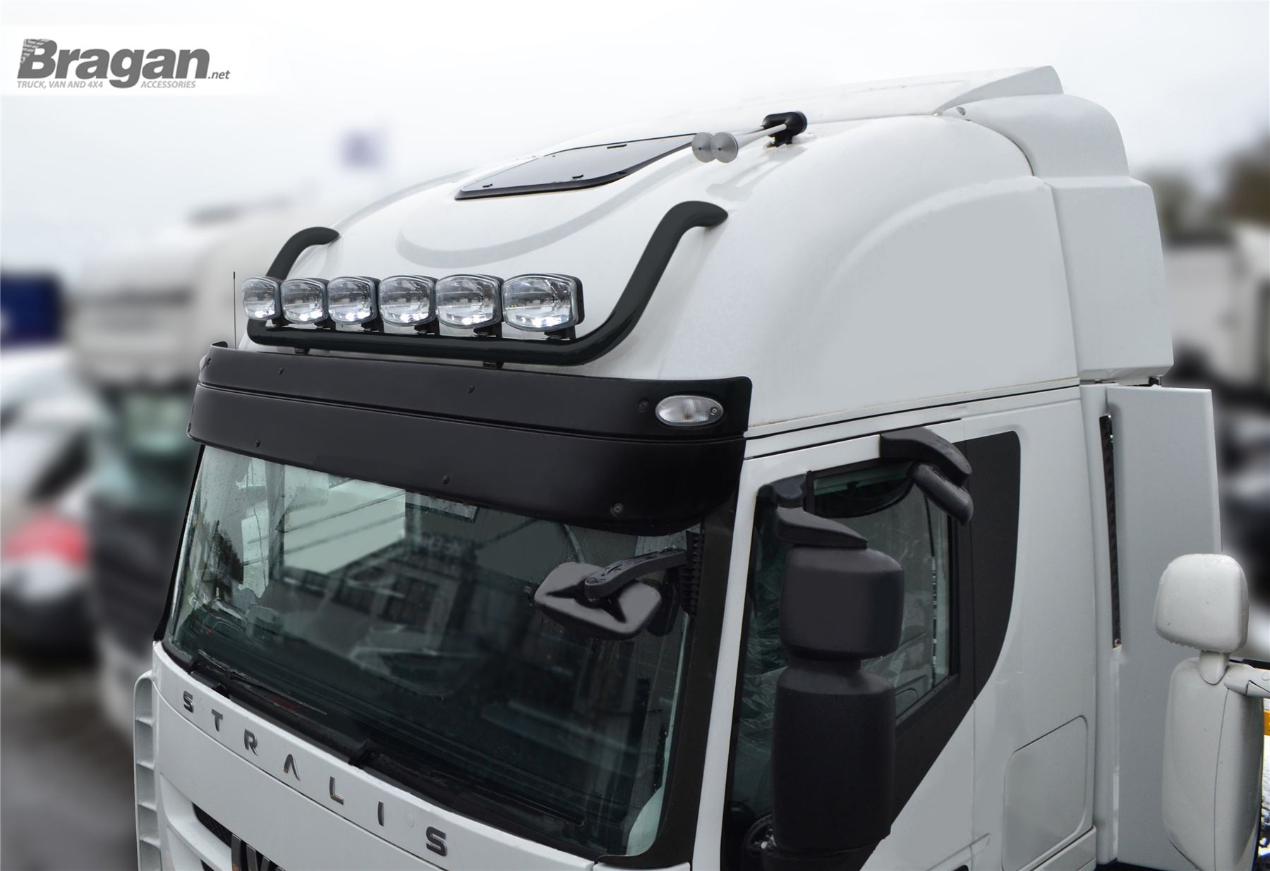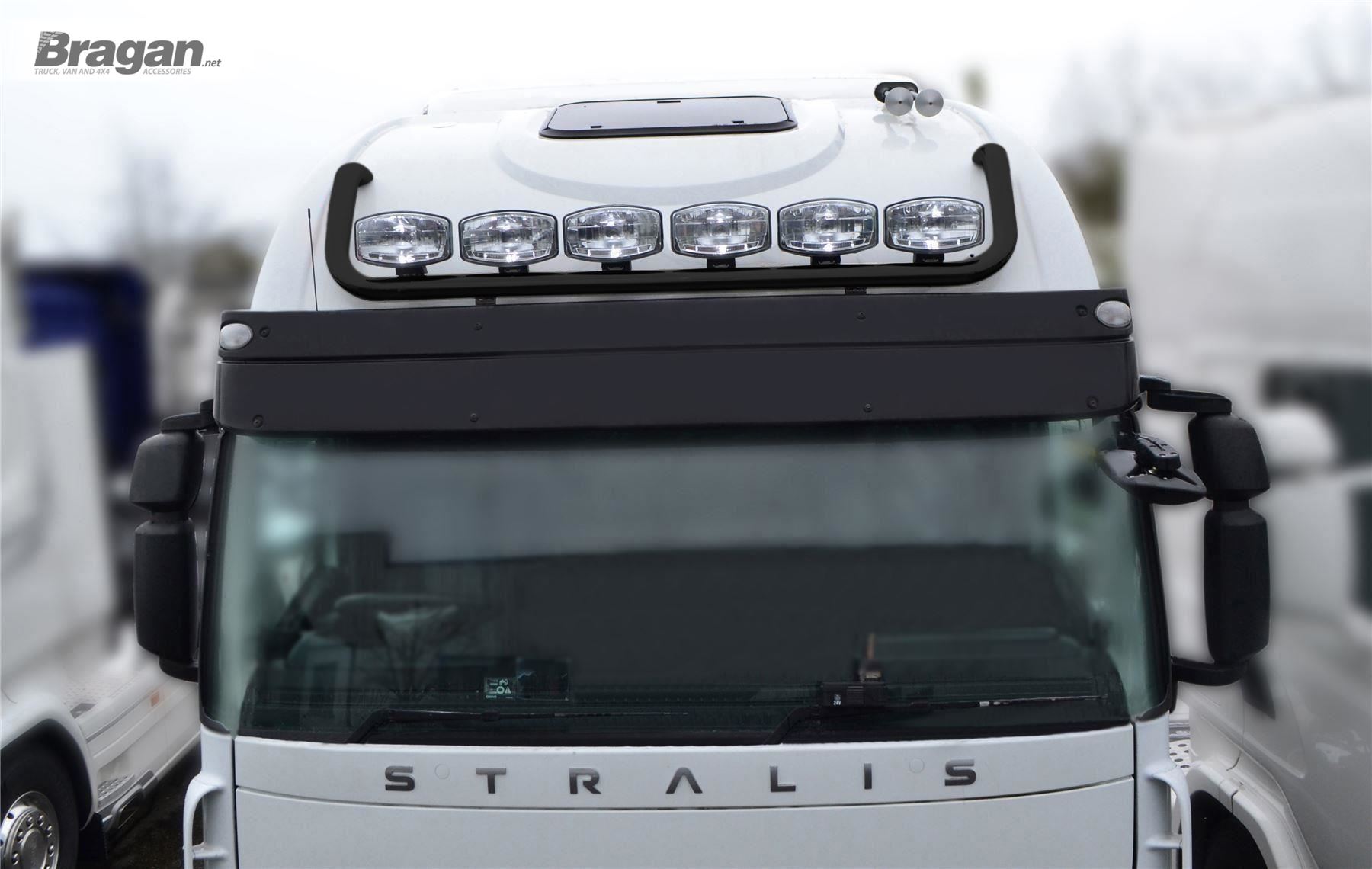High quality Black Powder Coated Stainless Steel Spot Light Roof Bar with 17" Night Blazer Dual Row LED Light Bar x3 for Iveco Stralis Cube + Hi-Way - Active Space Time Cab.