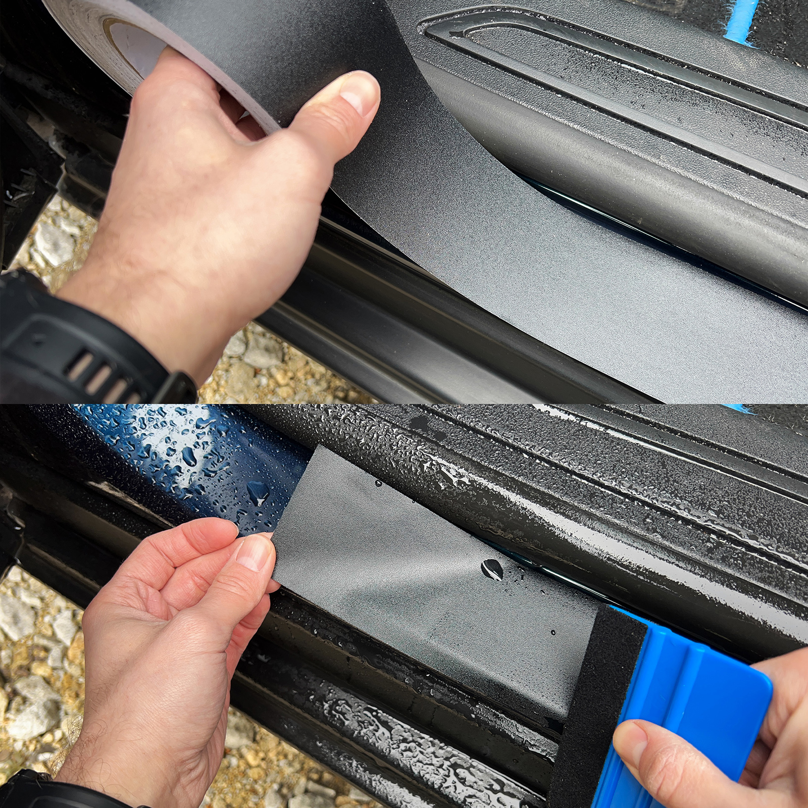 Autos – vollständiges Bekleben von Fahrzeugen (sogenanntes „Car Wrapping“). Die große Breite der Folie ermöglicht das Bekleben großer Karosserieteile ohne sichtbare Verbindungen, wie z. B. Dach, Motorhaube oder Kofferraumklappe. Auf diese Weise kann die Farbe einzelner Elemente verändert oder ein kontrastreiches Design erzielt werden. Zudem schützt die Folie den Lack vor mechanischen Beschädigungen wie Steinschlägen, Kratzern oder Abrieb. Kleine Unebenheiten auf der Oberfläche lassen sich ebenfalls leicht kaschieren. Besonders beliebt ist das Bekleben von empfindlichen Stellen wie Stoßfängern oder Schwellen.