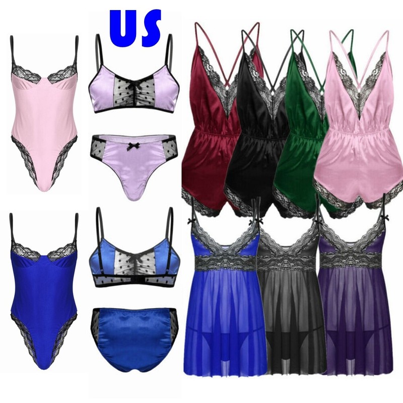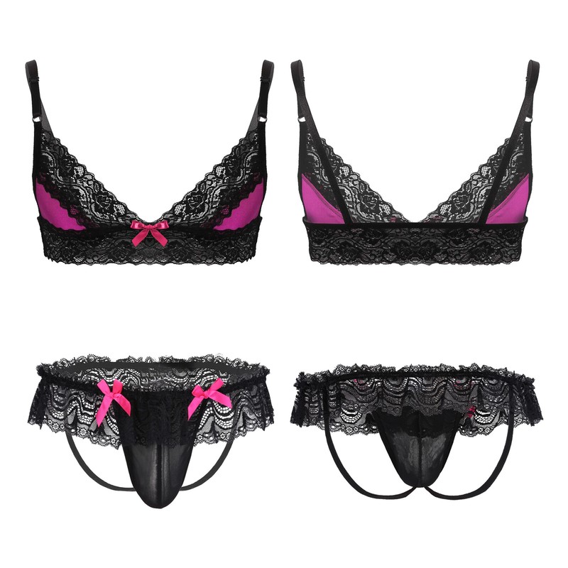 Mens Lingerie Suit Unlined Bra Top with Lace Bowknot Open Butt Jockstrap Thongs.