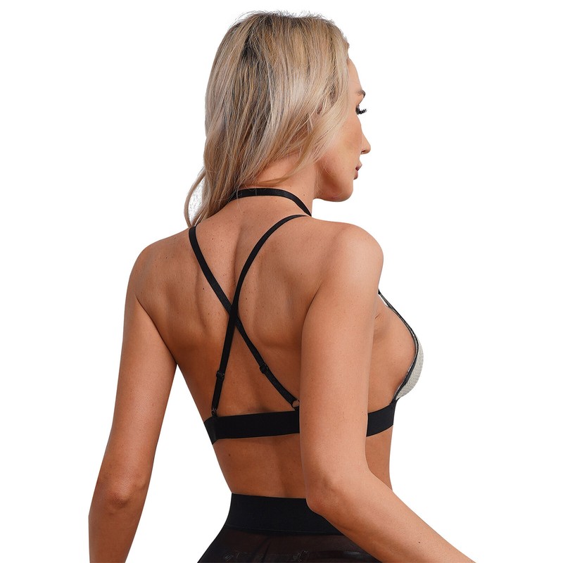 Designed with adjustable shoulder straps, wireless, halter neck integrated, fishnet triangle cups, elastic bottom bands, very sexy.