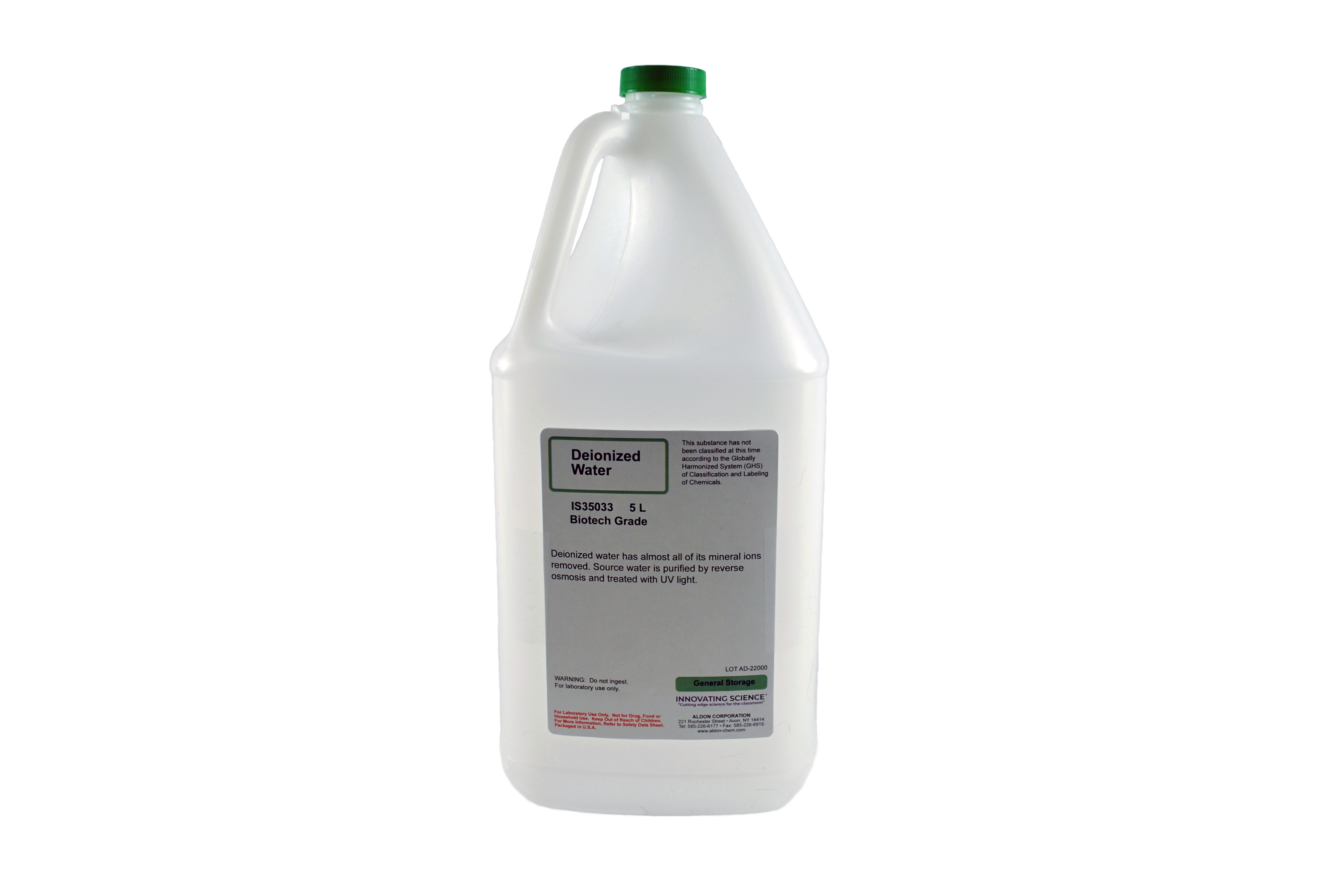 Biotechnology-grade Deionized Water is treated to remove all dissolved mineral salt ions. The large, 5,000ml (5L) size is both economical and practical for labs that consume large volumes. Often used where very pure water is required for more predicable results, the chemical is ideal for any chemistry or biology lab. Each bottle has safe handling and storage procedures printed directly on a GHS-compliant label. Shelf life: 24 months.