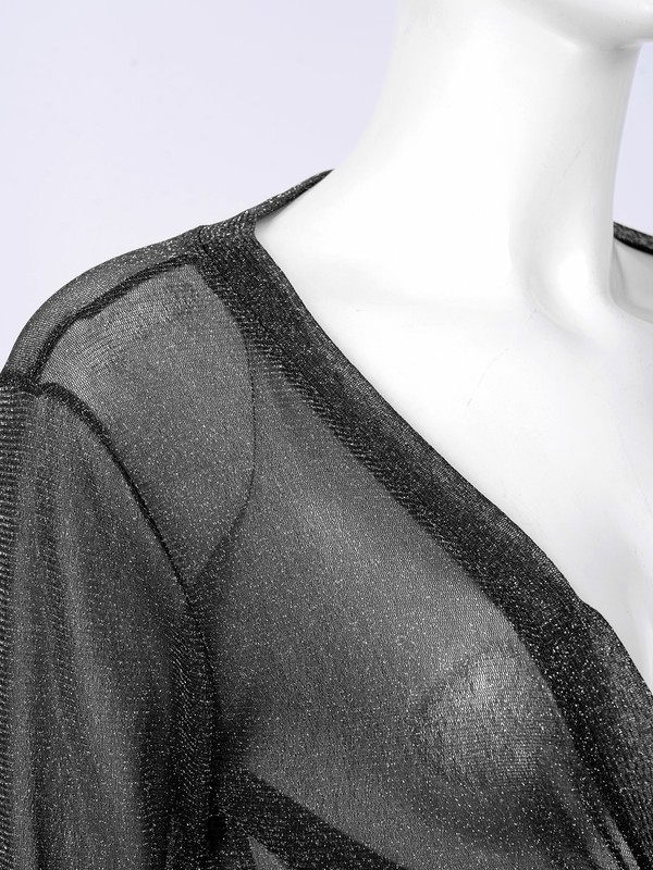 Half sleeve, open front, shiny see-through mesh design, self-tie knot at front bottom, good elastic fabric, making you attractive and charming.