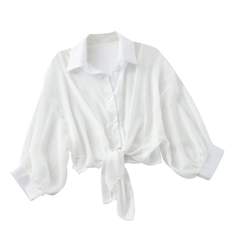 Women solid short chiffon bolero lapel long sleeve button down front knot thin cardigan for office beach.