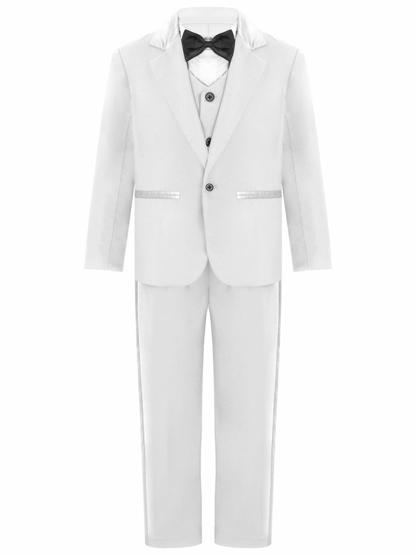 4pcs kids boys gentleman suit white shirt with bow pointed hem vest one-button blazer elastic waist pants.
