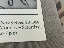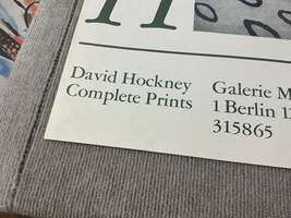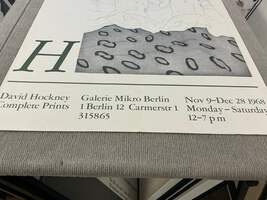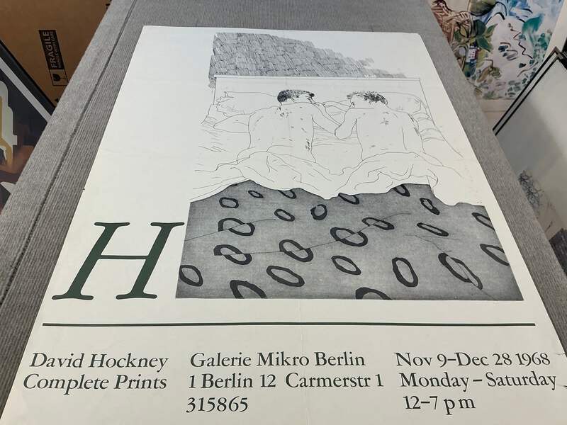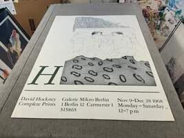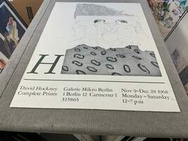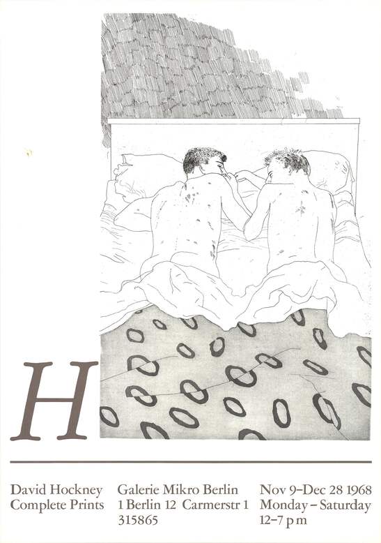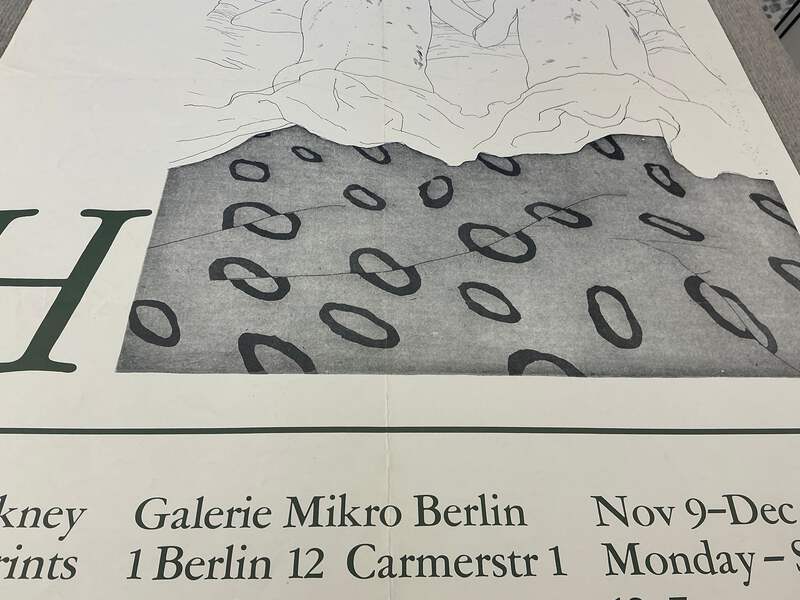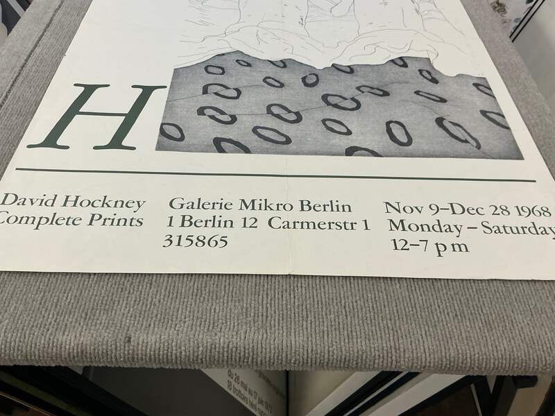Additional Details: This first edition exhibition poster was created for David Hockney's Complete Prints show at Galerie Mikro in Berlin in 1968. It features the artwork Two Boys Aged 23 or 24 from the C.P. Cavafy series, originally created in 1966. This piece is referenced as no. 9 in Brian Baggott's Catalogue. The C.P. Cavafy series is inspired by the works of the Greek poet Constantine P. Cavafy, with Hockney illustrating various poems that explore themes of love and desire. Two Boys Aged 23 or 24 is one of the key pieces from this series, showcasing Hockney’s ability to capture intimate and evocative moments with his distinctive line work and composition. Though not in mint condition, it retains its high collectible value due to its rarity and connection to Hockney's celebrated print series.