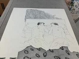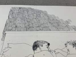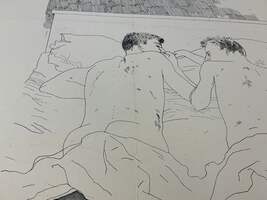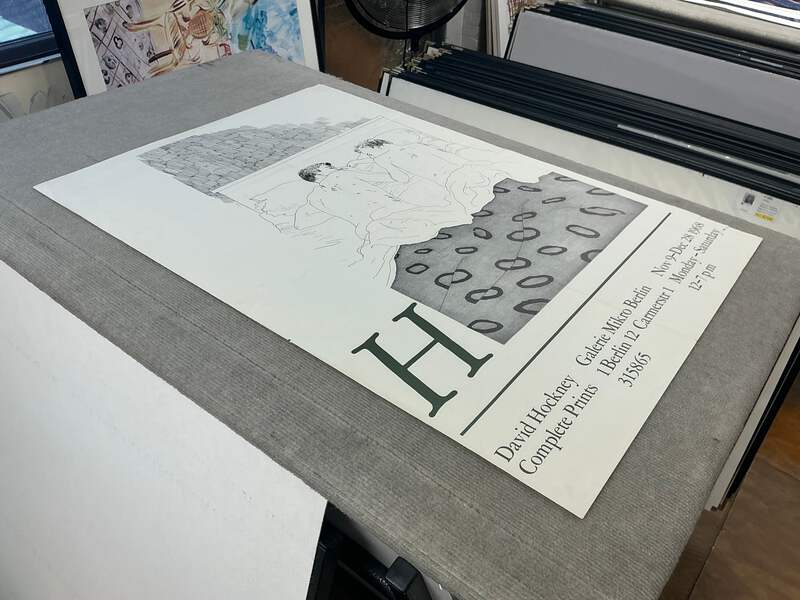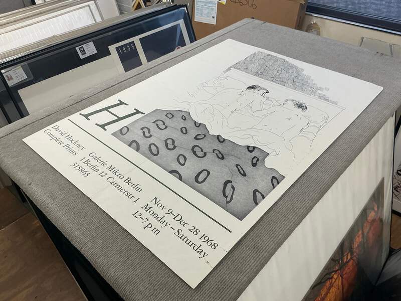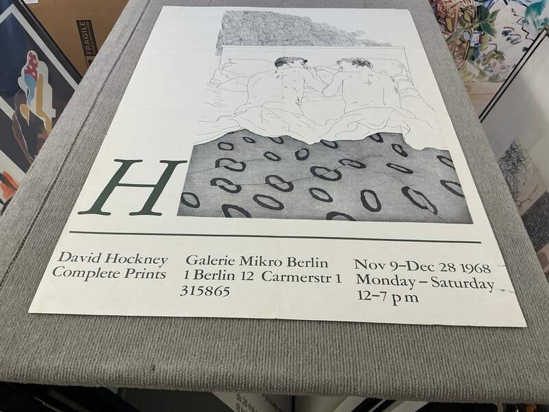 Sku: EF5830Artist: David HockneyTitle: Two Boys Aged 23 or 24Year: 1968Signed: NoMedium: Offset LithographPaper Size: 33 x 23.5 inches ( 84 x 60 cm )Image Size: 28 x 23.5 inches ( 71 x 60 cm )Edition Size: UnknownFramed: No: Inquire with our experts for framing suggestions.Condition: C: Several Signs of use and handling, some visible marksSupplemental Condition Information: Horizontal and vertical fold lines and creases throughout entire poster as well as some tearing in bottom right edge. Additional Details: This first edition exhibition poster was created for David Hockney's Complete Prints show at Galerie Mikro in Berlin in 1968. It features the artwork Two Boys Aged 23 or 24 from the C.P. Cavafy series, originally created in 1966. This piece is referenced as no. 9 in Brian Baggott's Catalogue. The C.P. Cavafy series is inspired by the works of the Greek poet Constantine P. Cavafy, with Hockney illustrating various poems that explore themes of love and desire. Two Boys Aged 23 or 24 is one of the key pieces from this series, showcasing Hockney’s ability to capture intimate and evocative moments with his distinctive line work and composition. Though not in mint condition, it retains its high collectible value due to its rarity and connection to Hockney's celebrated print series.