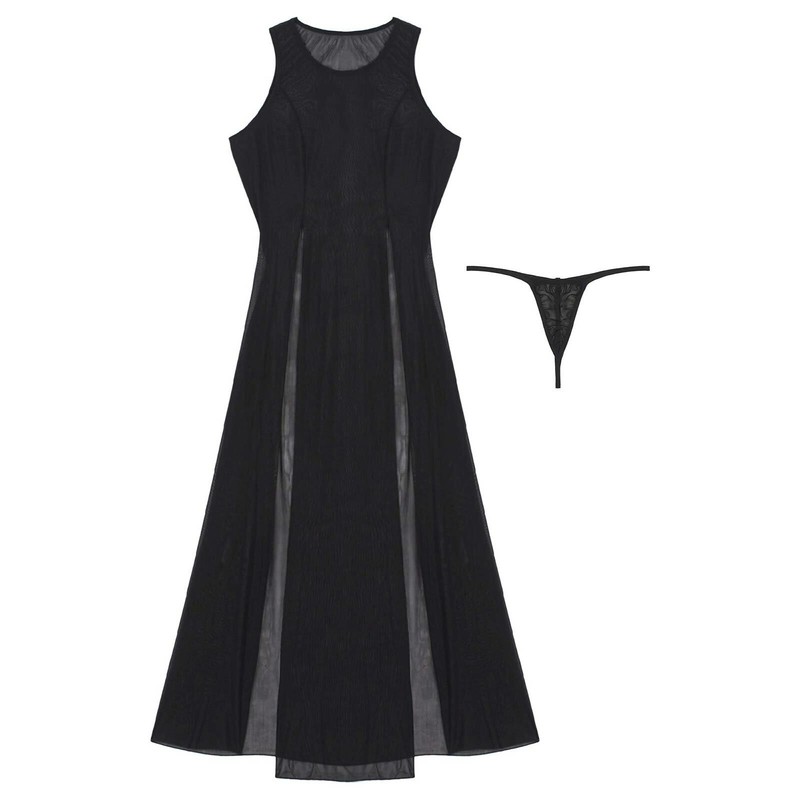 Womens See-through Mesh Split Dress Sleeveless Nightdress Bikini Cover Ups with G-string.