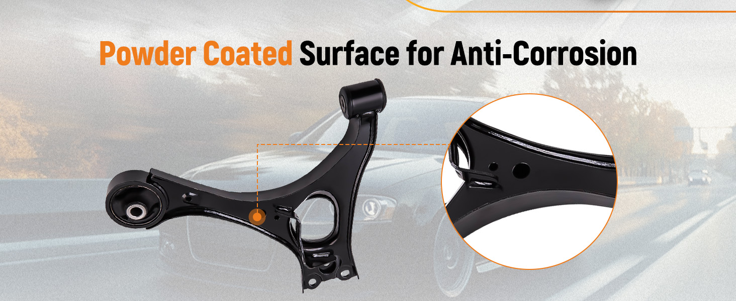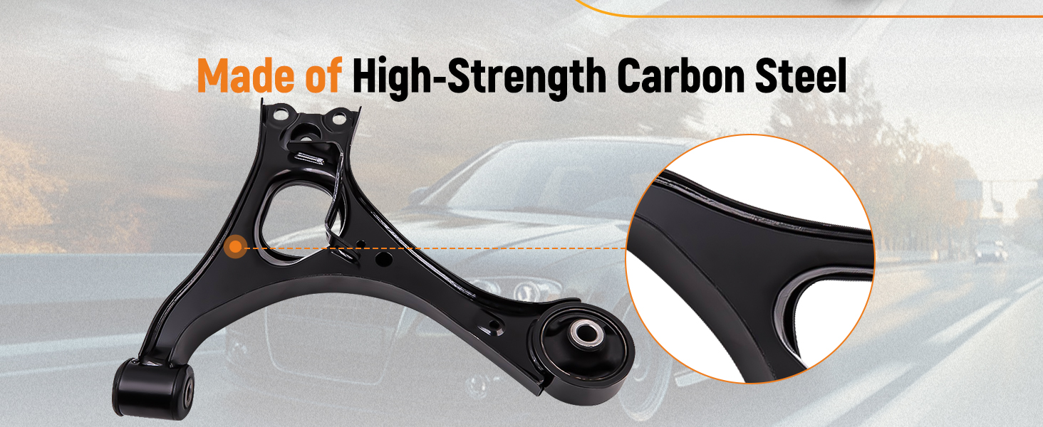 - Control arms are made of high-quality steel with black powder coating for stiffness, hardness and corrosion resistance