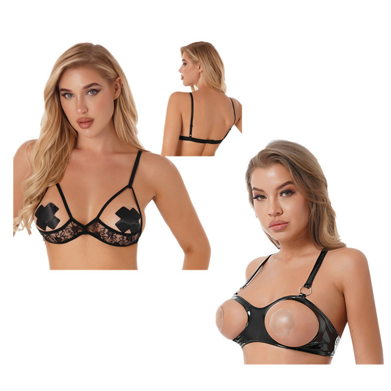 Womens Wet Look Patent Leather Open Cup Bra Tops O Ring Lingerie Underwear.