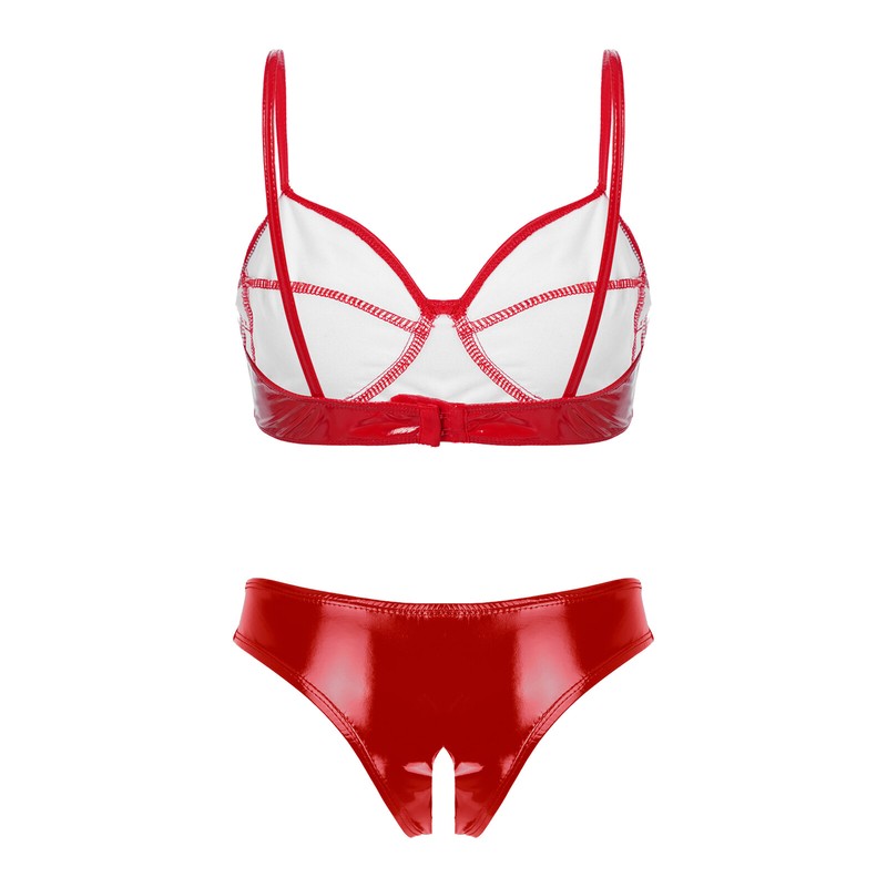 Womens Glossy Patent Leather Lingerie Set Underwear Bra Tops with Open Crotch High Cut Briefs.