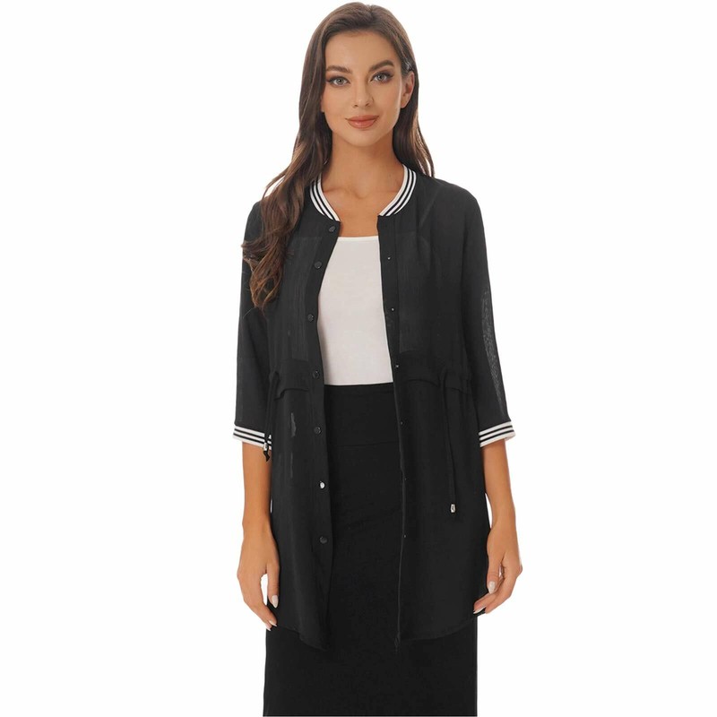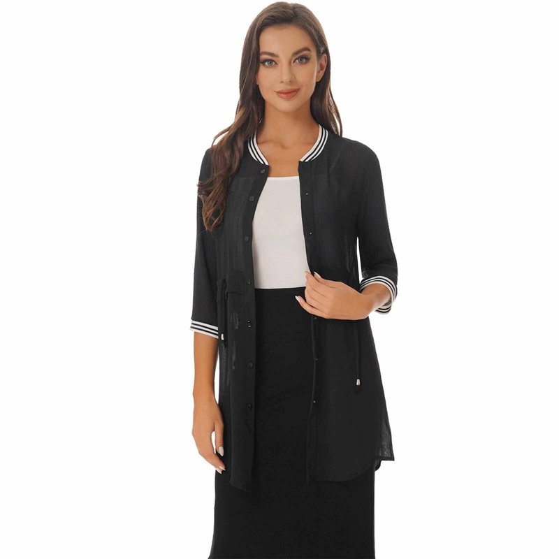 Womens Chiffon Cardigan 3/4 Sleeve Outwear Semi See-through Drawstring Cover Ups.