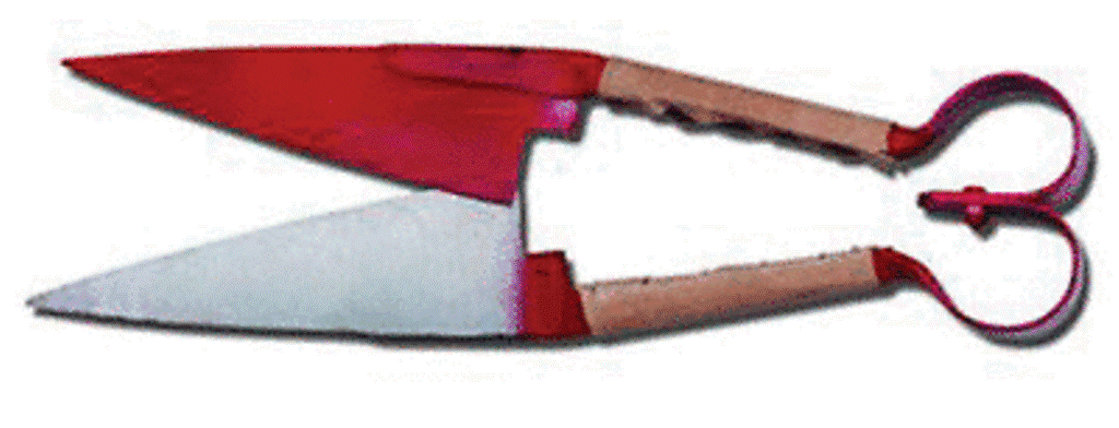 Unrigged English-style sheep shears with double bow. For trimming, tagging, blocking and preparing sheep for show rings. Ideal for all-around use. Straight 6" blade. Made with red enamel handles with sewn on leather grips.