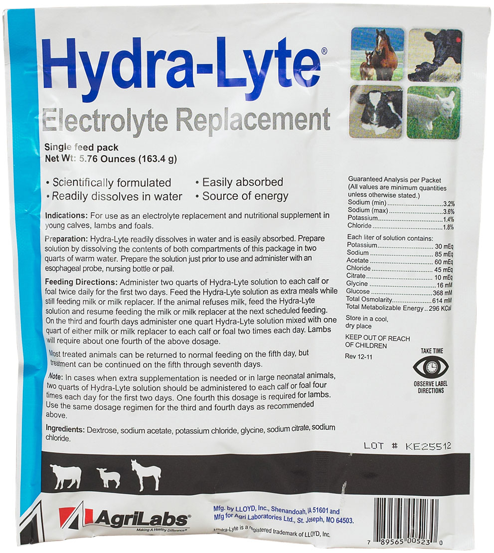 An energy-rich electrolyte replacement and nutritional supplement for young calves, lambs and foals. Restores normal body fluid and electrolyte balance to help reverse loss of body weight. Contains: potassium, sodium acetate, sodium chloride, sodium citrate, dextrose, glycine and glucose. Give 2 quarts solution to calves and foals twice daily for the first two days, then on days 3 and 4, mix 1 qt. solution with 1 qt. milk or milk replacer. Lambs require about 1/4 of the above dosage.