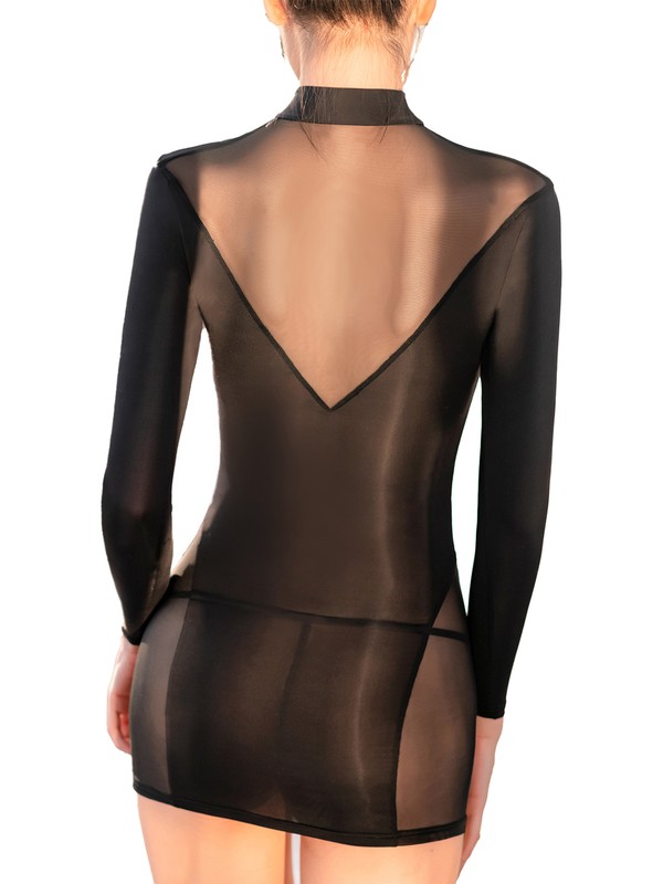 Womens Sheer Mesh Patchwork Bodycon Dress Mock Neck Long Sleeve Dresses with G-string.