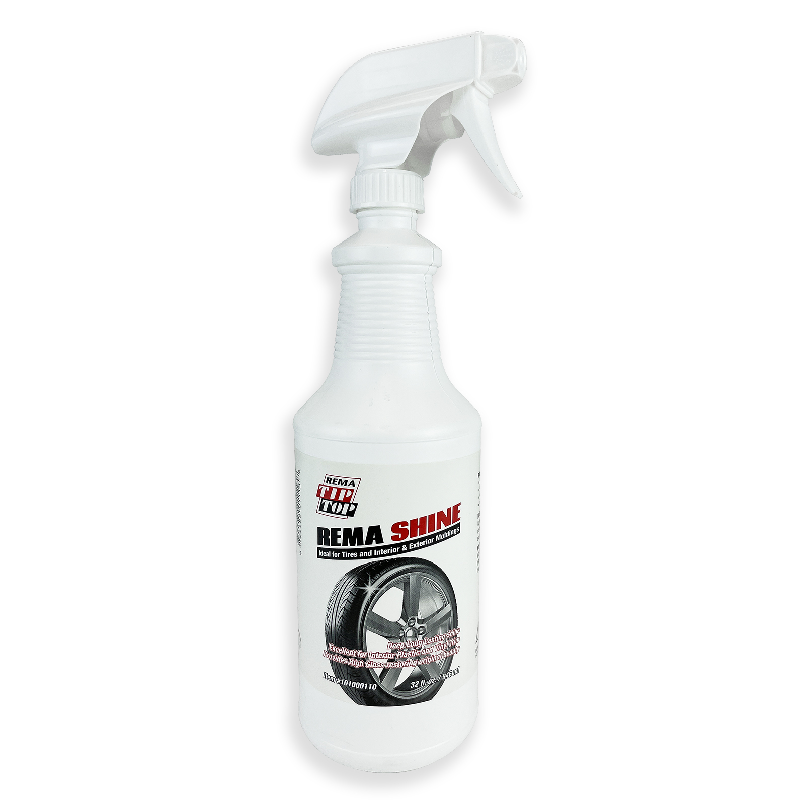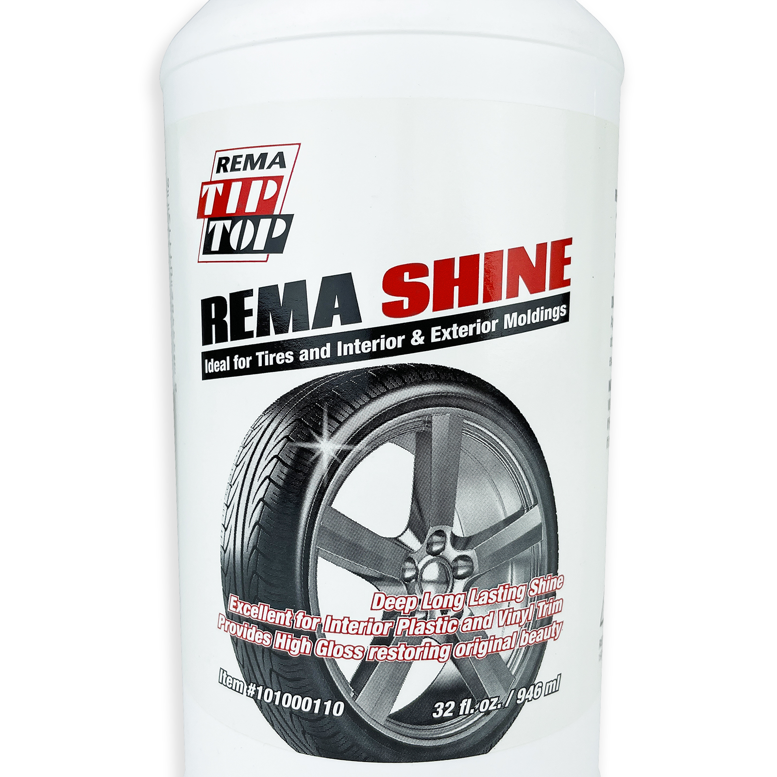 REMA TIP TOPs Rema Shine is a water based silicone dressing that leaves a deep long lasting shine to your car or trucks tires, exterior moldings and interior plastic and vinyl trim. Rema Shine provides a high gloss restoring the original beauty to your ride. The convenient, ready to use formula has a pleasant odor and is VOC compliant meaning this has been certified for domestic and industrial use and poses no health risks to humans. REMA TIP TOP proudly manufactures Rema Shine in the USA.