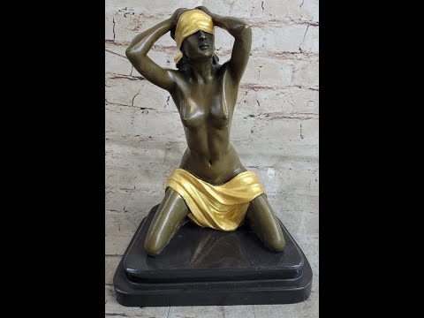 Celebrate the beauty of the human form with this captivating bronze sculpture depicting a woman in a vulnerable yet captivating pose. With an air of anticipation, she sits on her heels, arching her back gracefully and intertwining her hands behind her head. Despite the blindfold, she tilts her head upward, evoking a sense of longing and hope.