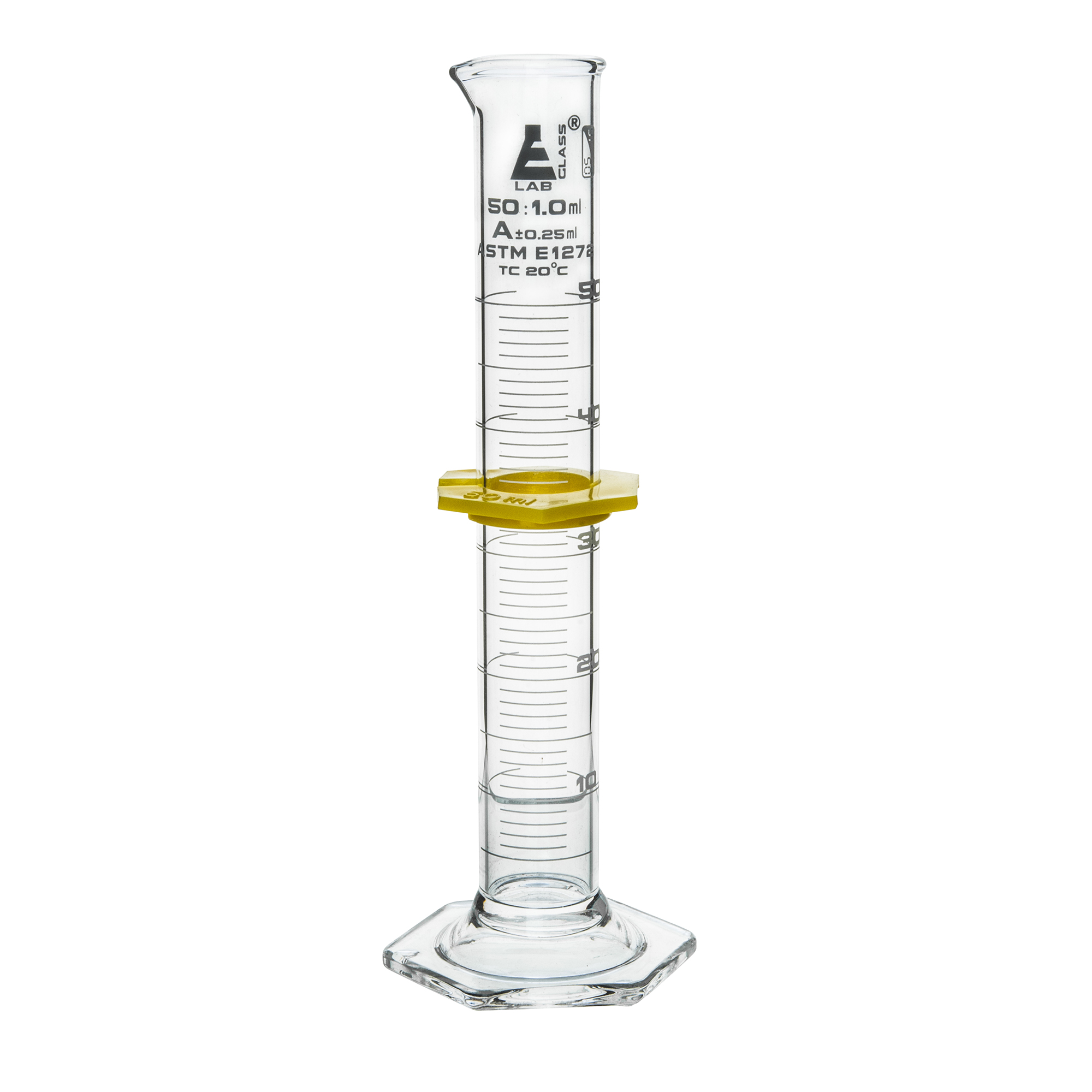 50mL capacity measuring cylinder made of high quality, heavy duty Borosilicate 3.3 glass. Cylinder has a large, white single scale in 1.0 mL graduations and an hexagonal base for extra stability. Class B tolerance, +/-0.25mL as per ISO/ASTM. Fitted with a plastic, hexagonal protective collar. Cylinder stands 7.75" tall, with a base measuring 2.4" wide. Inner diameter of cylinder body measures 22.9mm (0.9"), and outer diameter measures 25.4mm (1.0").
