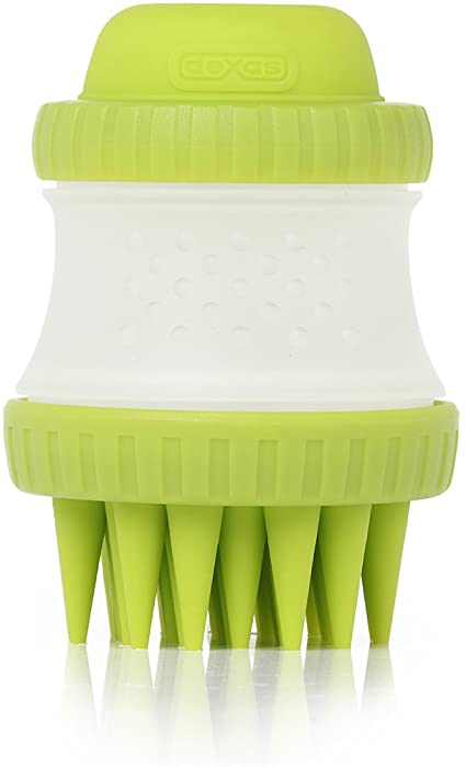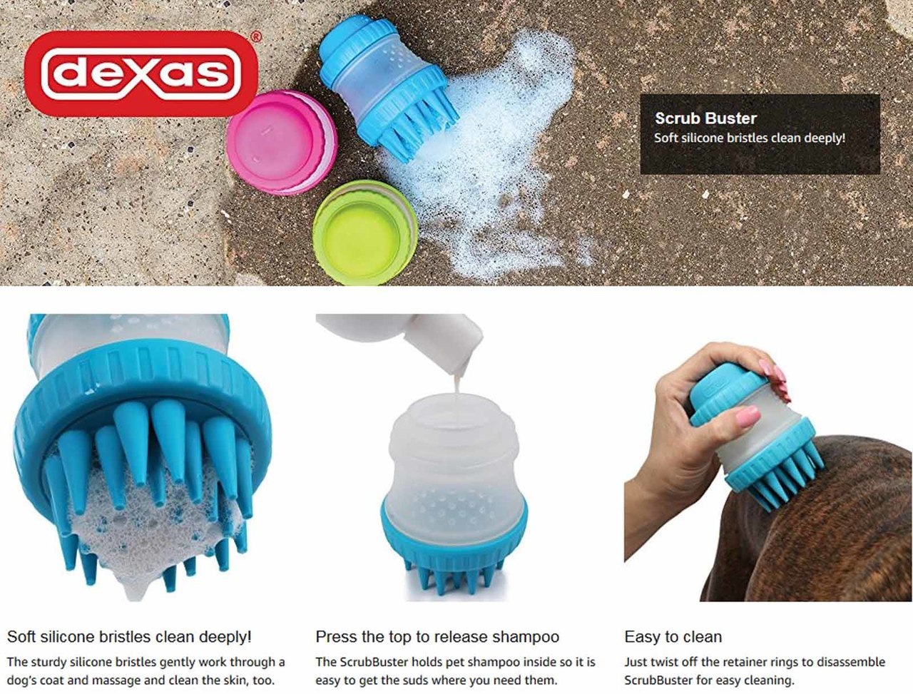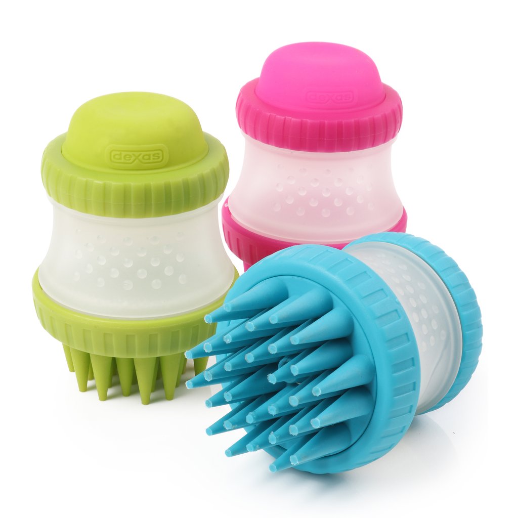 Gentle Silicone Bristles That Dogs Love! The Dexas ScrubBuster provides a quick and thorough washing of a dog's coat, with soft silicone bristles that reach all the way down to the skin. It even has a dog shampoo reservoir built in!