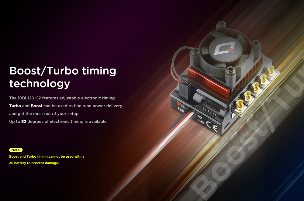 Motor Limits: 4-6 cells NiMH / 2S LiPo:3.5T(1/10 On-road),4.5T (1/10 Off-road) 8-9 cells NiMH / 3S LiPo:8.5T (1/10On-road),10.5T (1/10 Off-road)
