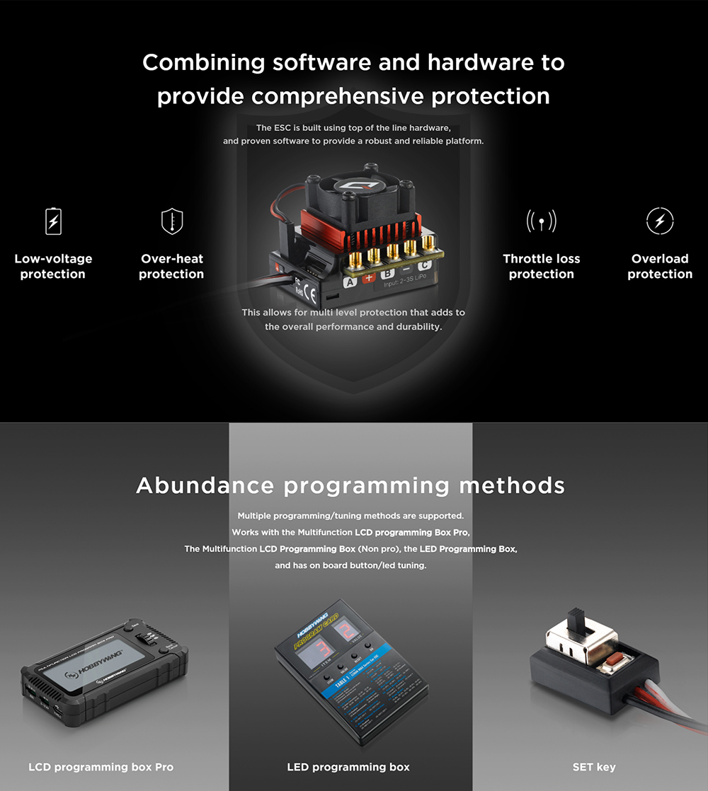Multiple protections include: Lowvoltage cut-off protection for Lipo or NiMH battery Over-heat protection Throttlesignal loss protection Motor Lock-up protection. Throttle out of control protection, overload protection for escort escort, reliability and durability have been greatly improved.