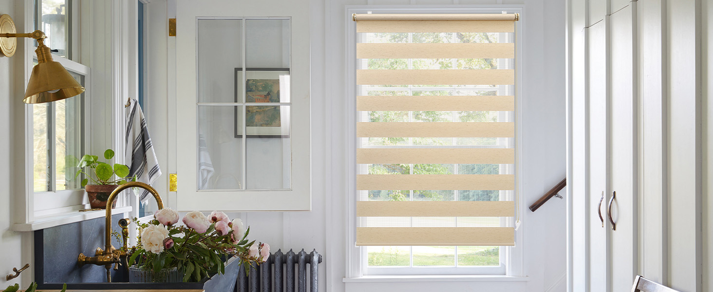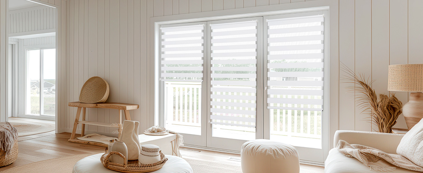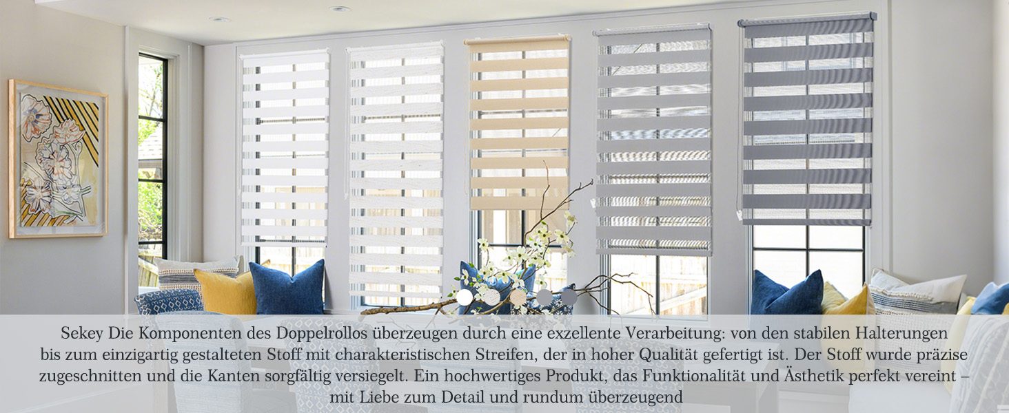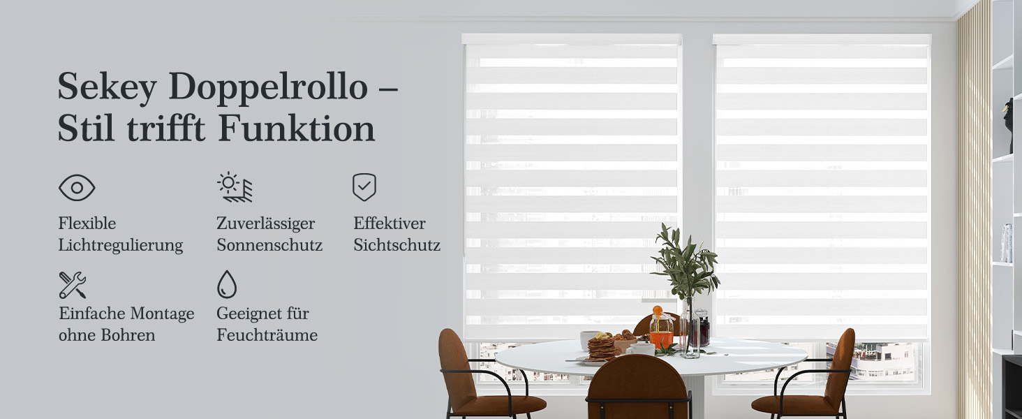 1️⃣ Sonnenschutz & Sichtschutz – Doppelrollo mit zwei Stoffbahnen zur stufenlosen Lichtregulierung per Kettenzug. Effektiver Blendschutz und Privatsphäre bei Tag & Nacht.