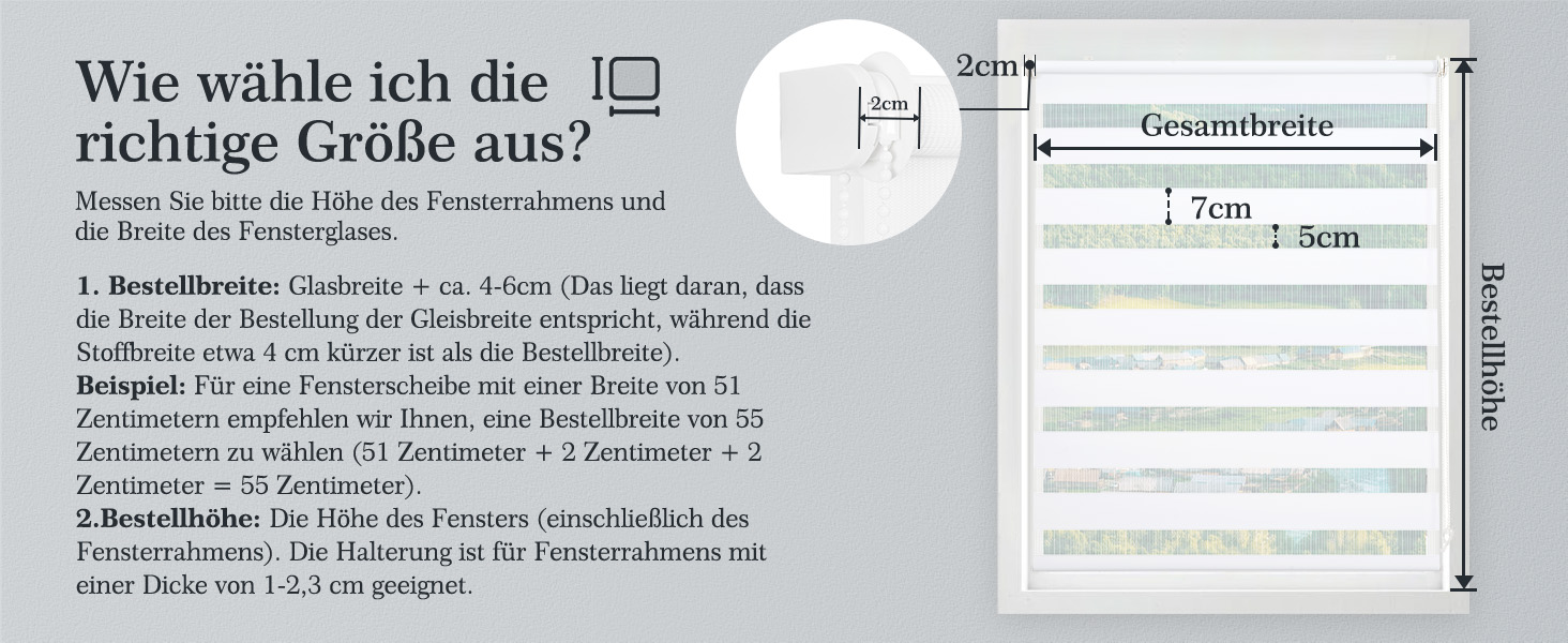 5️⃣ Passgenaue Maße – Bestellbreite = Glasbreite + 4–6 cm. Stoffbreite ca. 4 cm schmaler als Bestellbreite für optimale Passform ohne Lichtspalten.