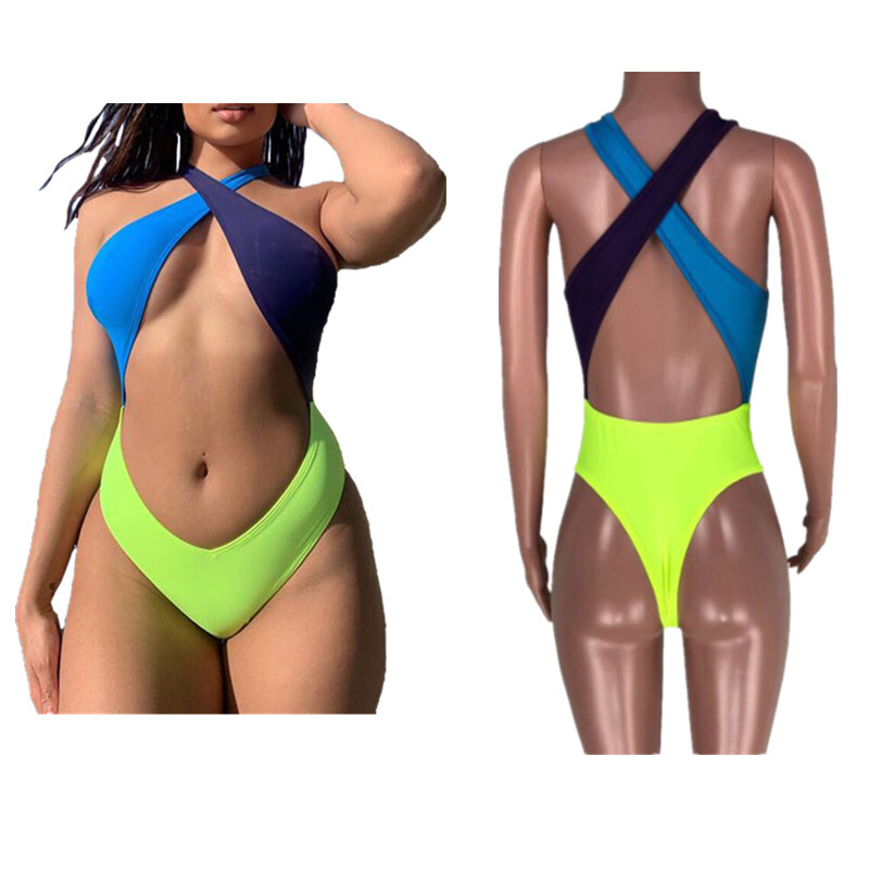 Women’s One-piece Rompers Crew Neck Jumpsuit Sleeveless Splicing Color Swimsuit, pull on closure.