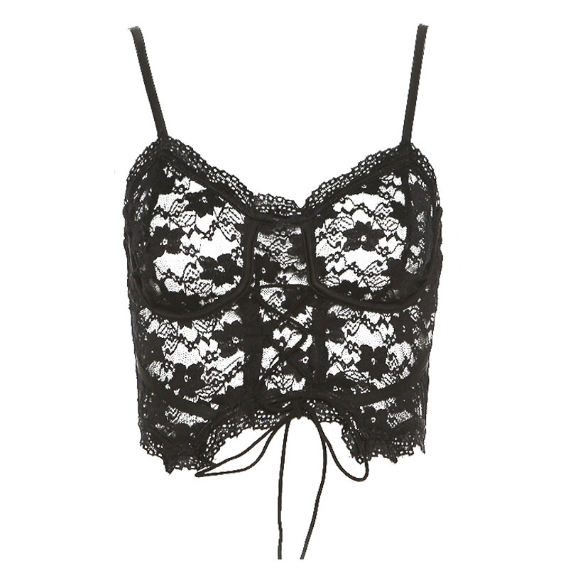 Women Fashion See-through Lace Crop Top Floral Pattern Lace-up Front Camisole Vest.