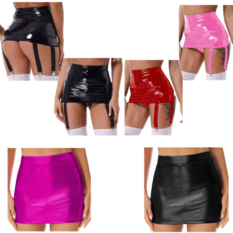 Women Shiny Leather High Waist Mini Skirt with Garter Belt Bodycon Sexy Clubwear