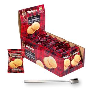 This Walkers Shortbread Highlanders come in convenient snack packs perfect for take along anywhere you go. Each pack contains 2 Shortbread round cookies. There are 18 packs per box. Total of 36 cookies. With each order you will receive 1 modern brushed stainless steel stirring spoon for your coffee or tea while you are enjoying your cookies.