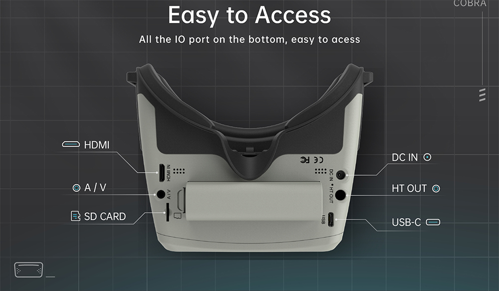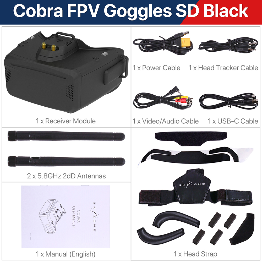 The SKYZONE Cobra is a FPV goggle with LCD screen , the screen have vivid color and high luminance , pilot can see more details in the racing . With RapidMix receiver, the receiver merge two signal to one, avoid image tearing and rolling when signal is weak, make image more stable and clear in challenging condition. The goggle support pilot wear glass while fling. The new OS with several languages to set select, pilot have no trouble with the menu system, with shuttle wheel and new user interface, pilot can set all the setting just by rolling the wheel without taking off the goggle. The goggles can Power by 1 cell battery or 2~6s lipo battery, the USB charging and DC charging make goggle simple to use in the filed.