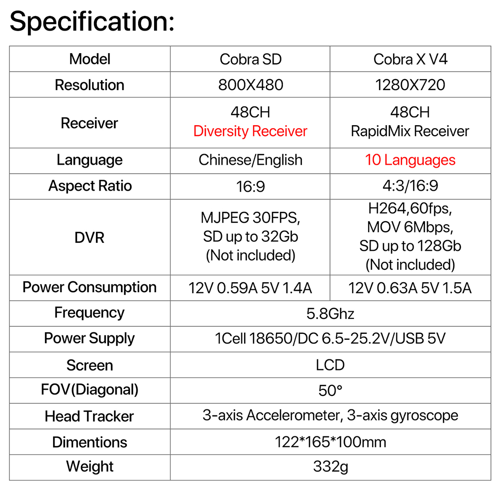 Model | Cobra SD | Cobra X V4 |