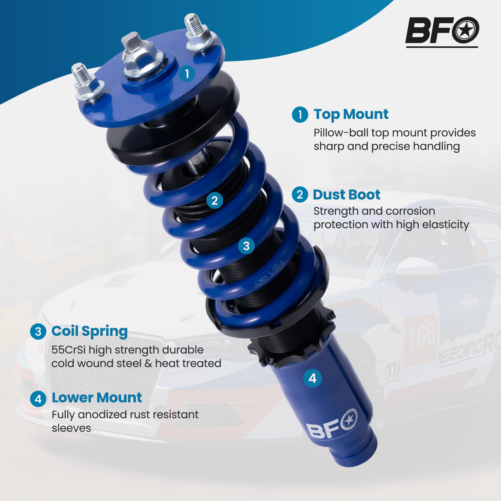 BFCO coil-overs are designed as entry-level for street use. It features height adjustable and adjustable camber plates (applicable for some vehicles), which offer you a lowered stance, and improved performance for your daily use vehicle.