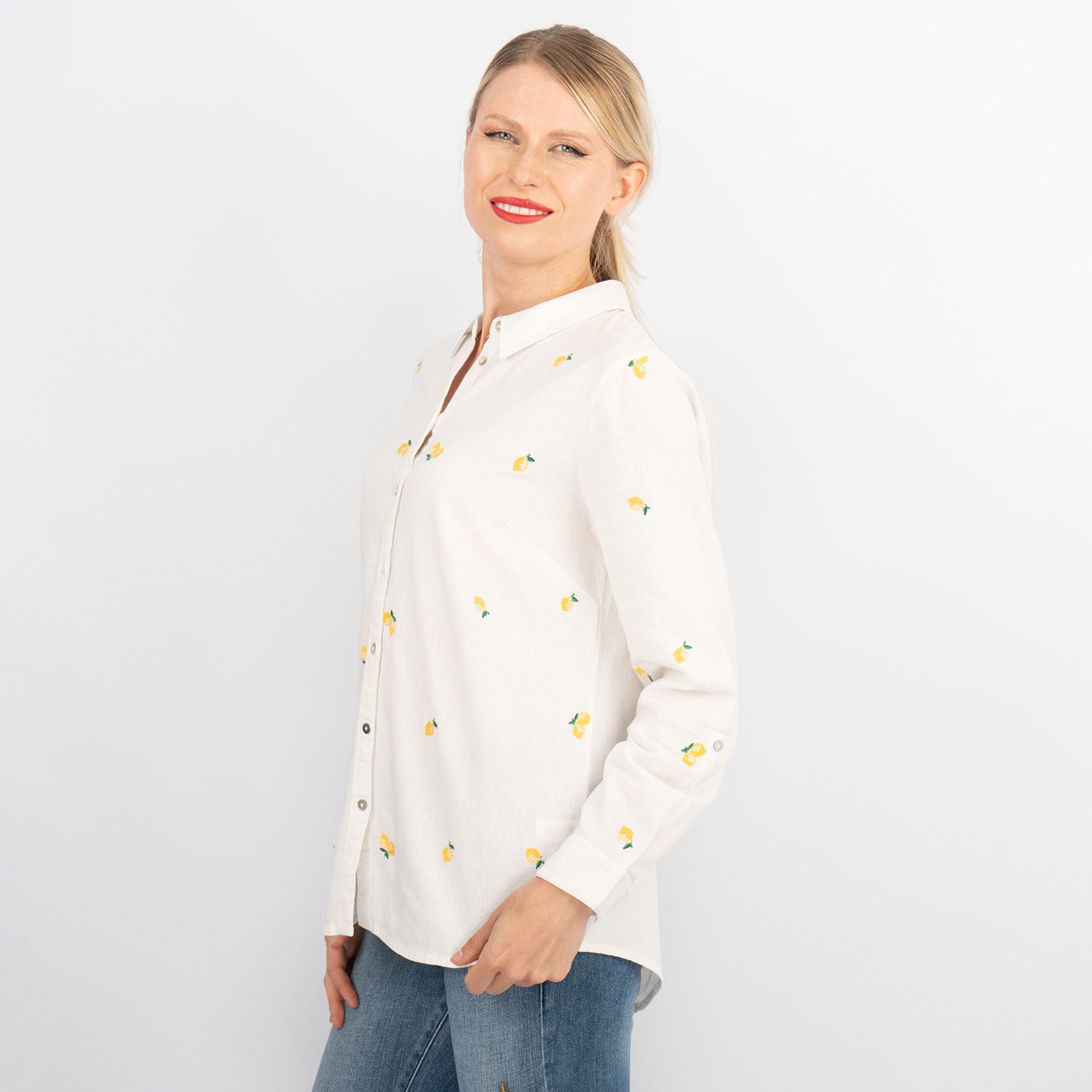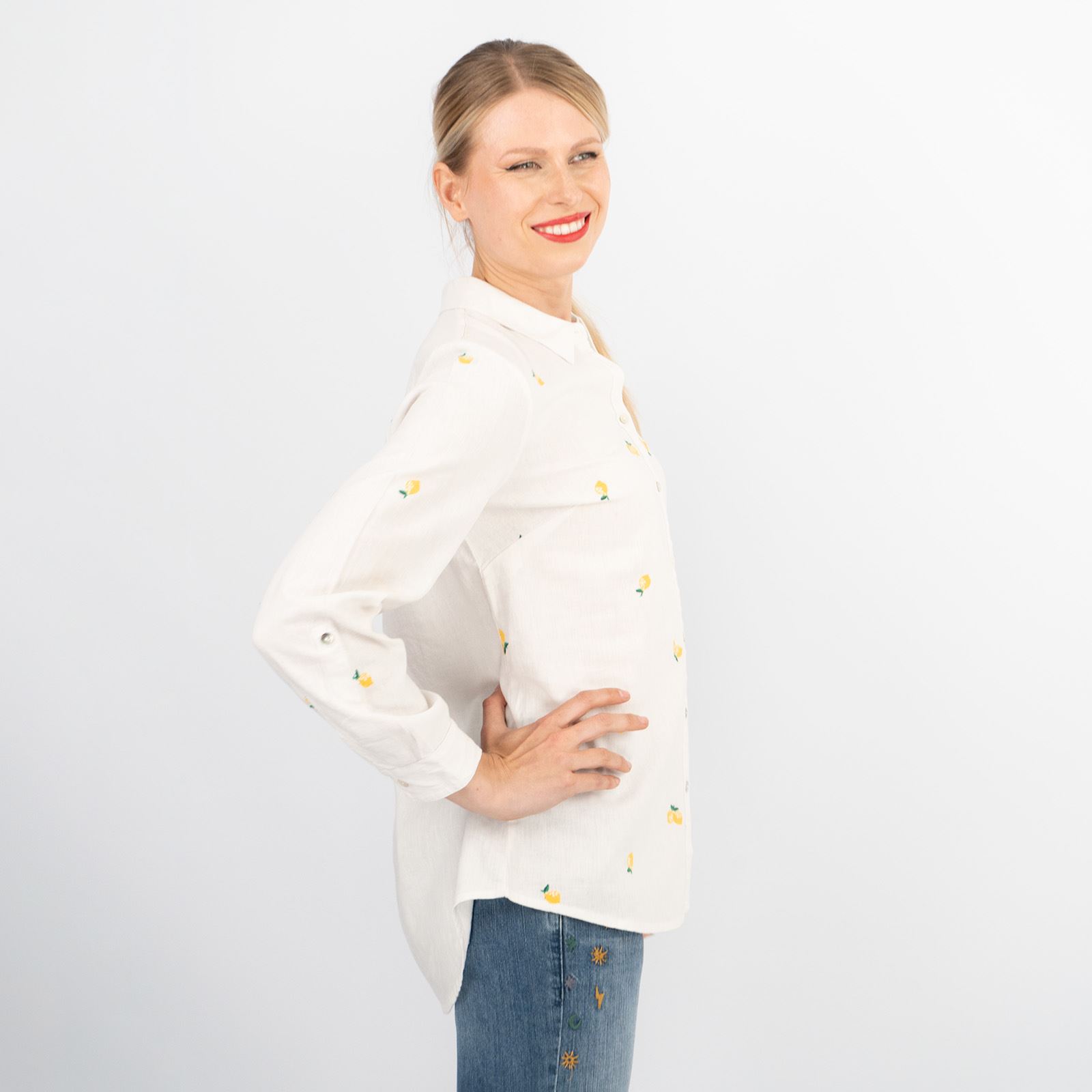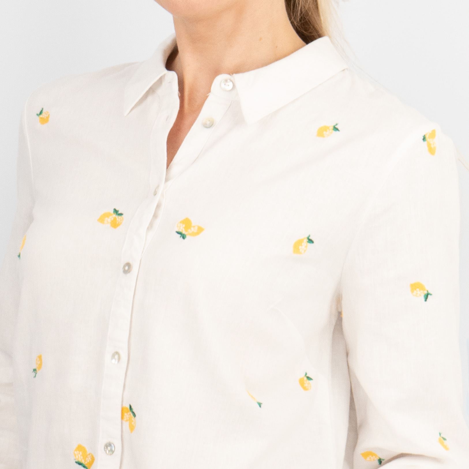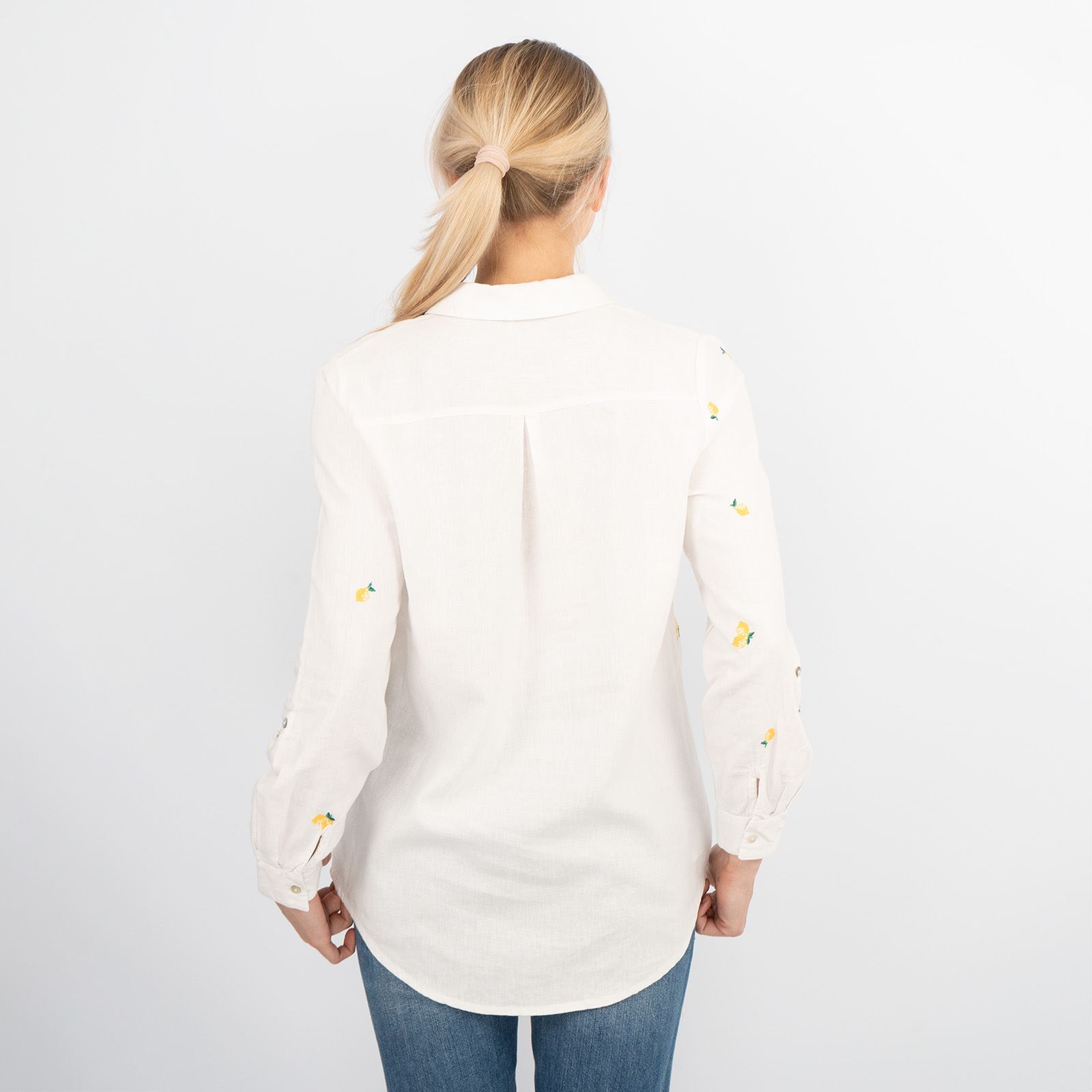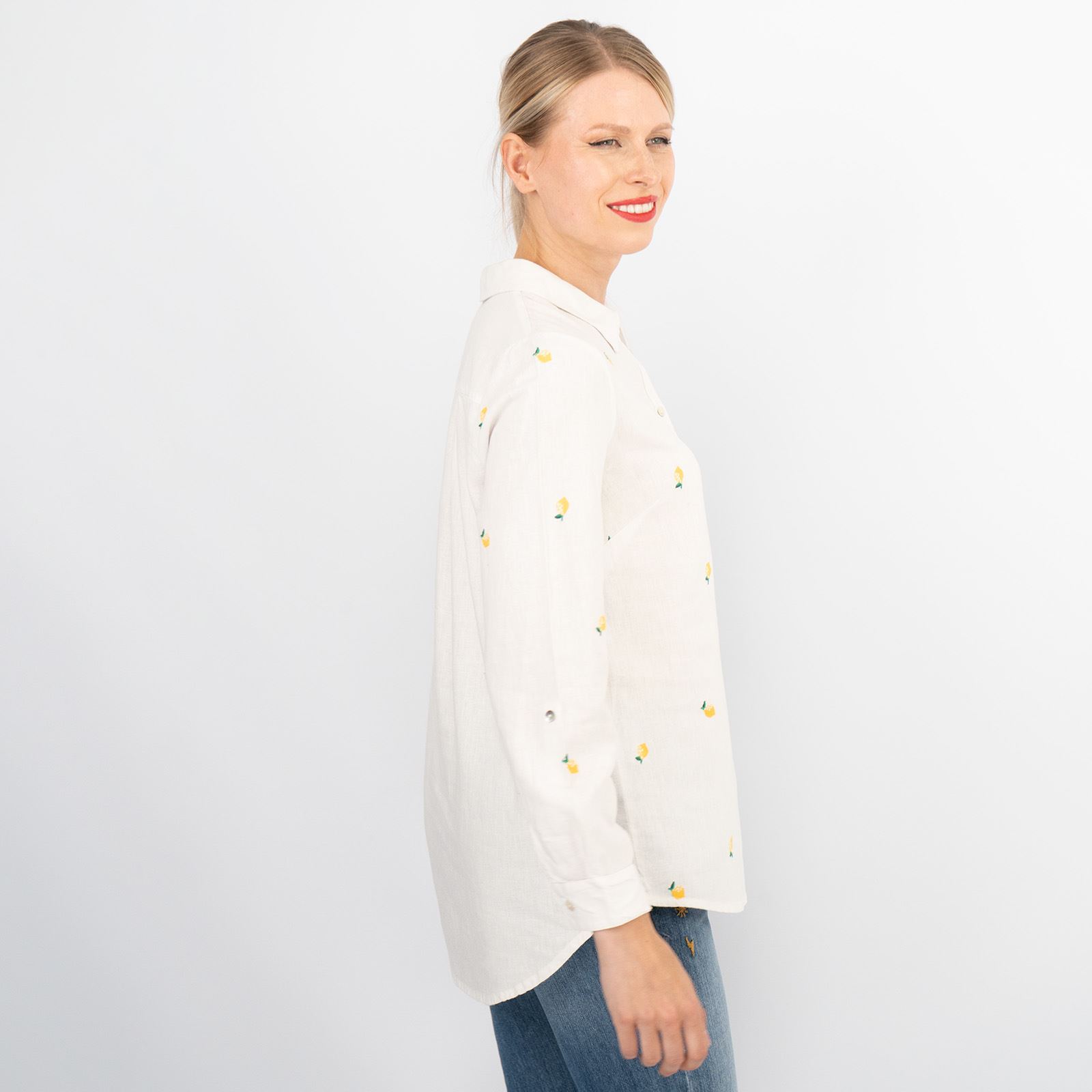 Fell fresh and a lightweight with this beautiful lemon embroidered shirt. Made from a linen-rich fabric, it has a collar, button-through front and long sleeves.