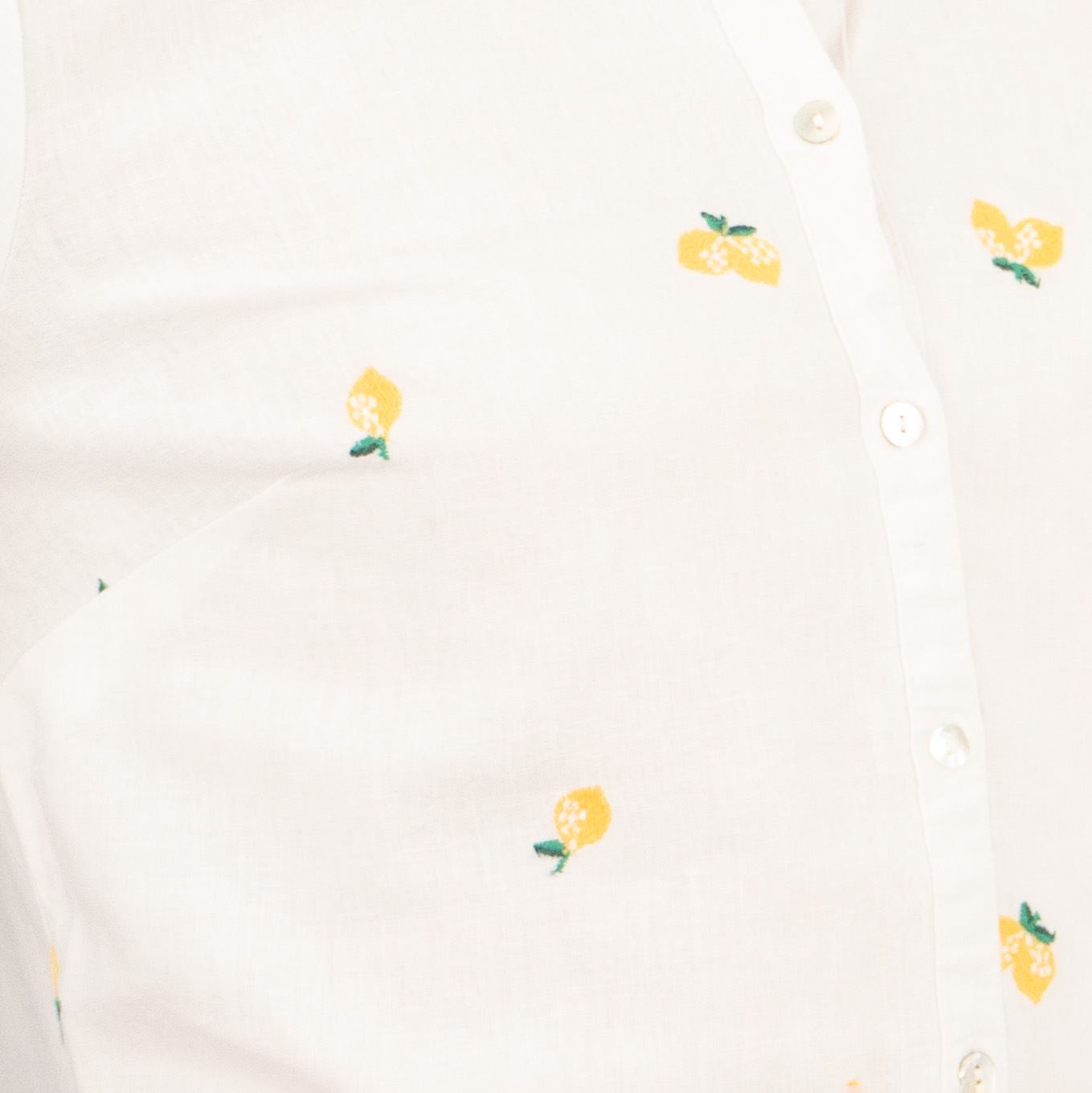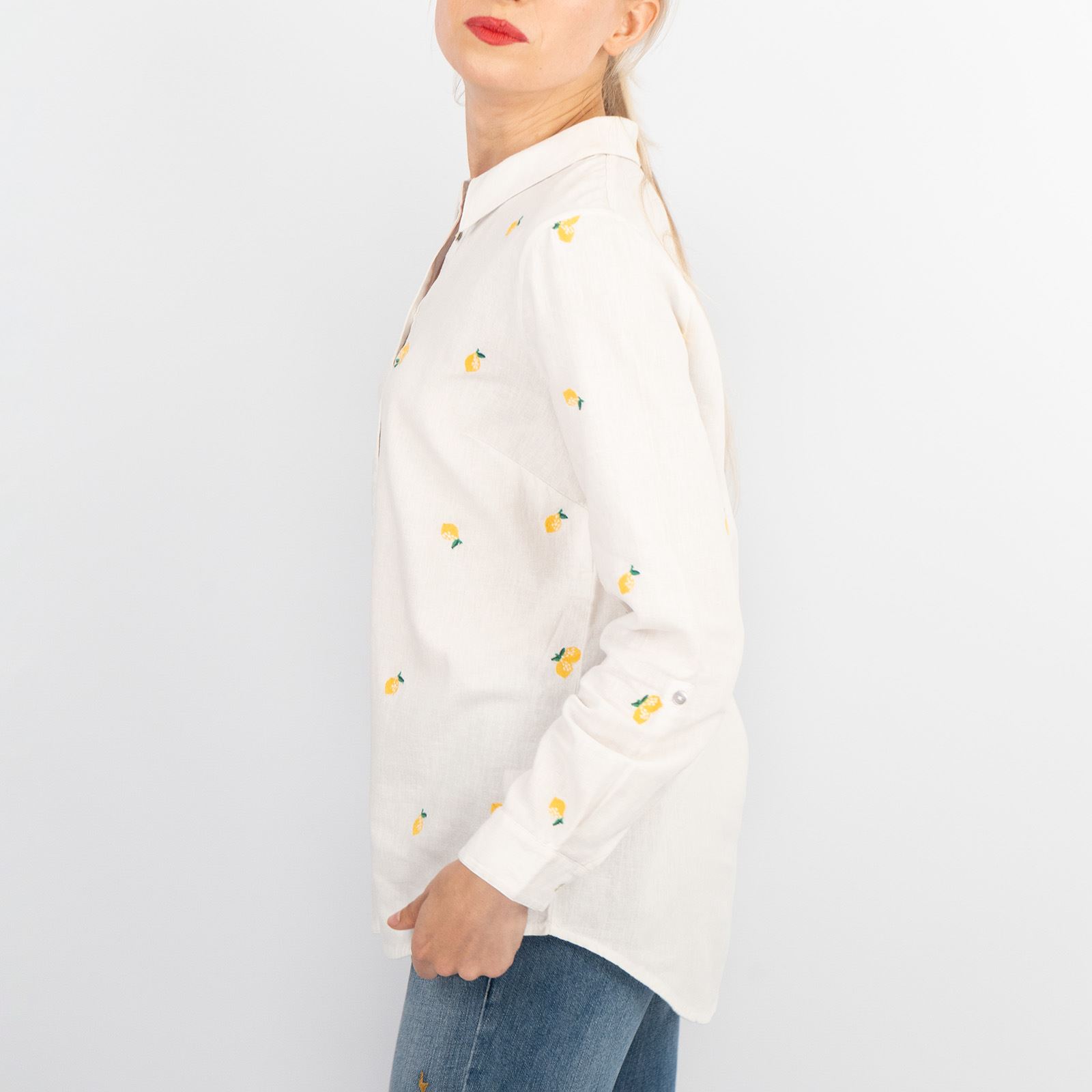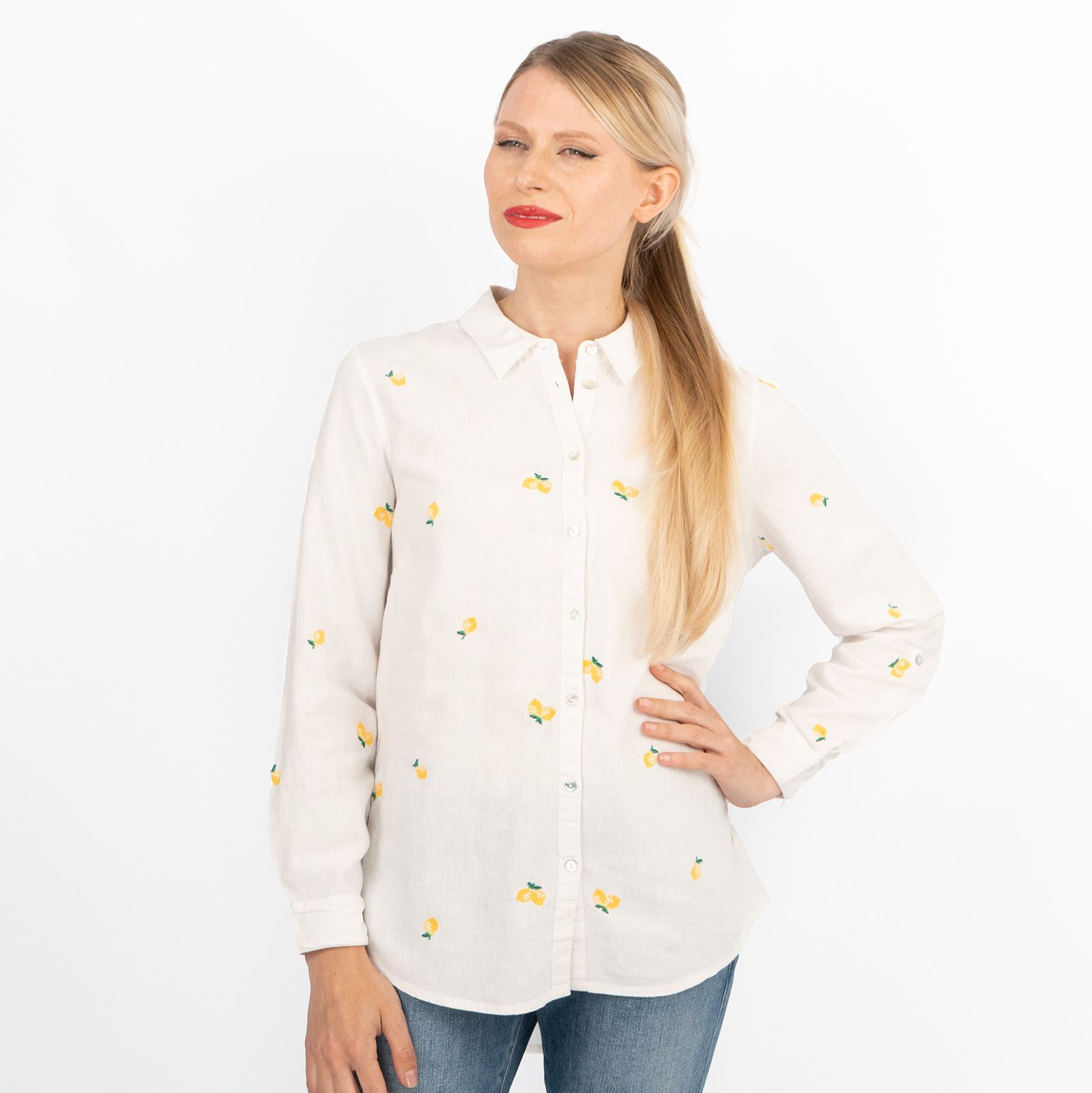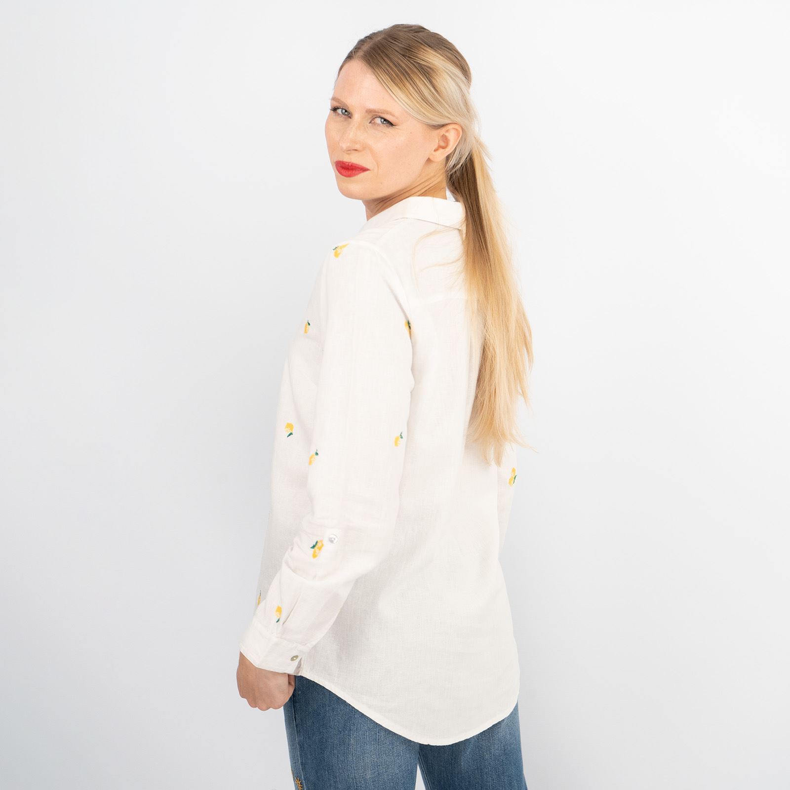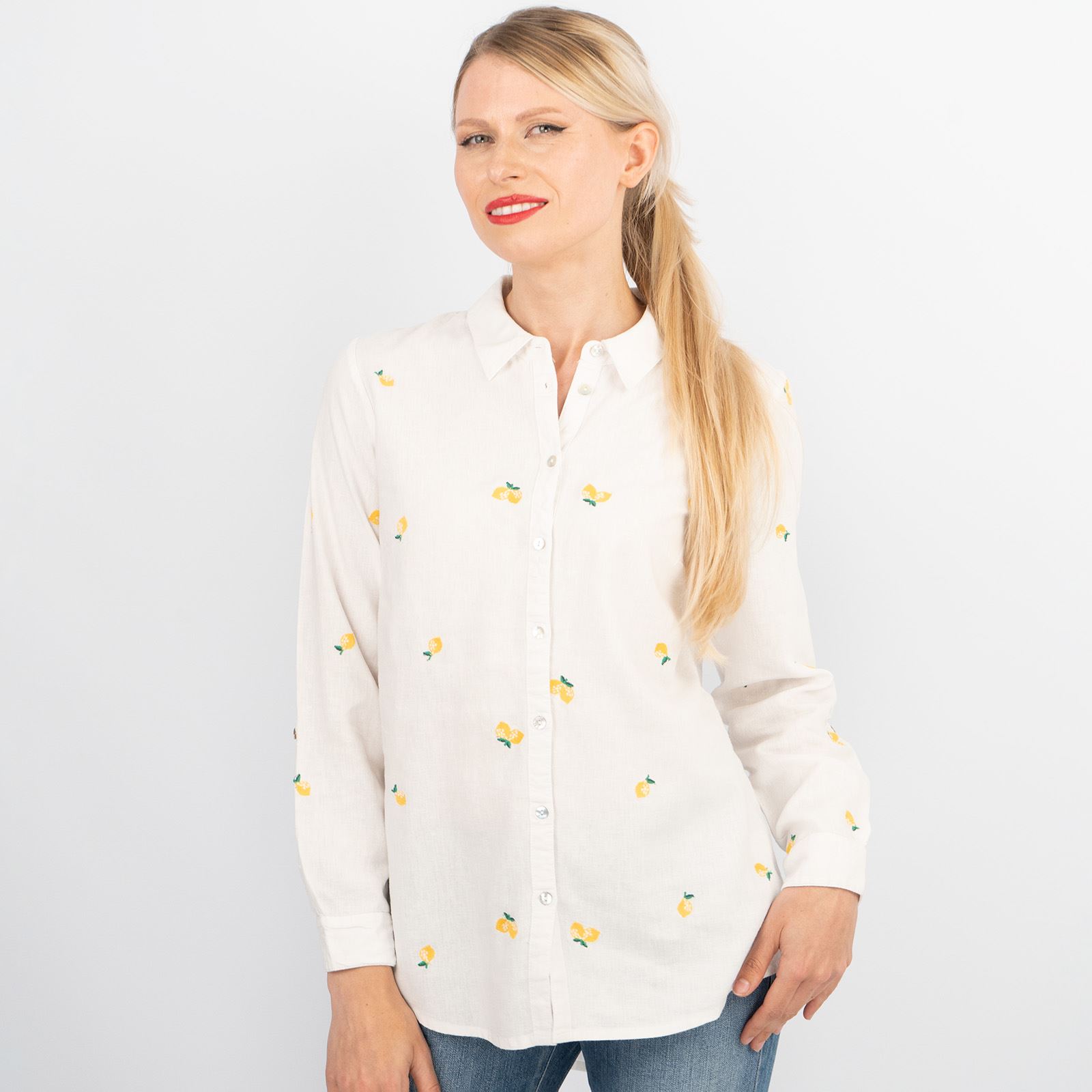 Fell fresh and a lightweight with this beautiful lemon embroidered shirt. Made from a linen-rich fabric, it has a collar, button-through front and long sleeves.