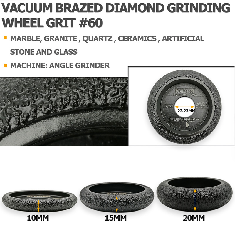 Product Name: 75mm Vacuum Brazed Diamond CONVEX Wheel Profile grinding wheel Specification: Diameter 3"/75mm; Arbor 22.23mm; Diamond Height: 10mm, 15mm, 20mm; Grit: #60 Quantity: 1pc Machine: Angle grinder Application: Can be used dry or wet Grinding on marble, granite , quartz , ceramics , artificial stone and glass; Especially for concrete outside wall in building or decoration; Partial flattening of floor and edging fine of marble or granite boards. High efficiency and several times better than electroplated products Wet grinding is helpful for the working life ==================The End=====================